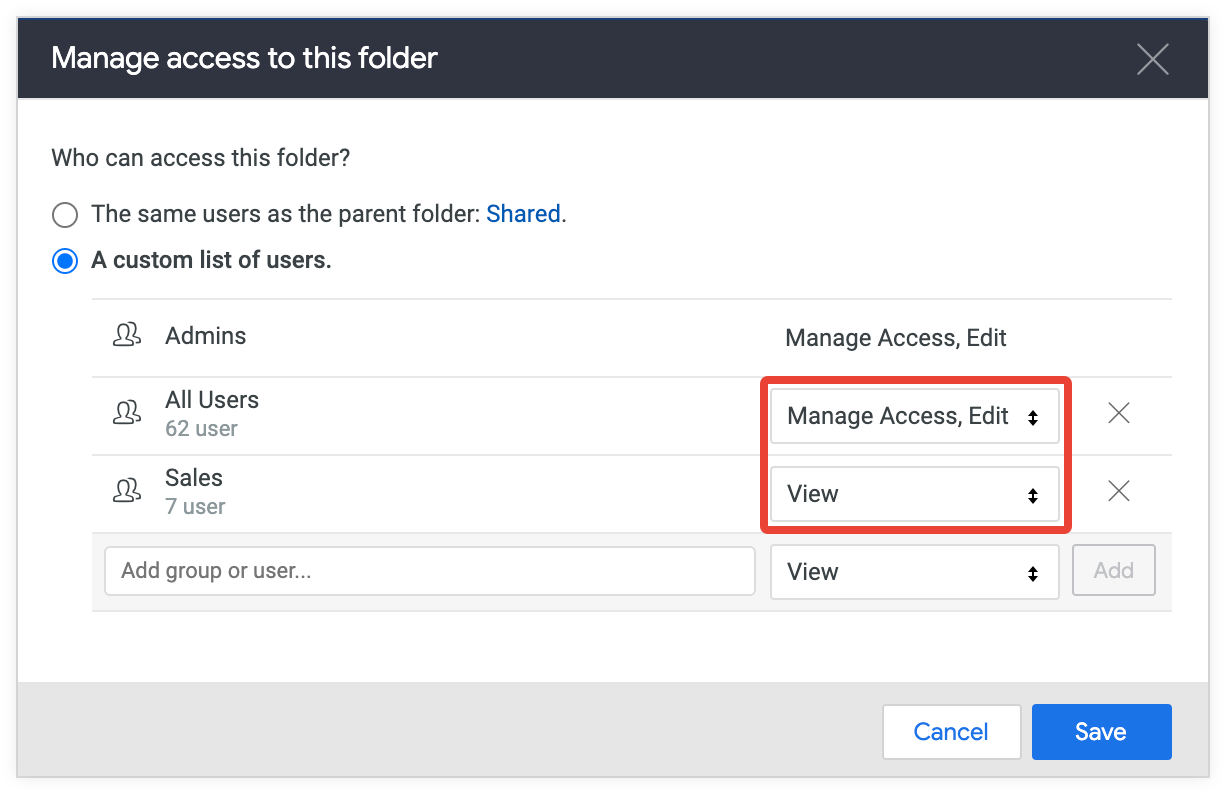 To change the access level for a user or group, select the current access level and choose the one that you want instead. You cannot change the ability of Looker admins to manage the folder.