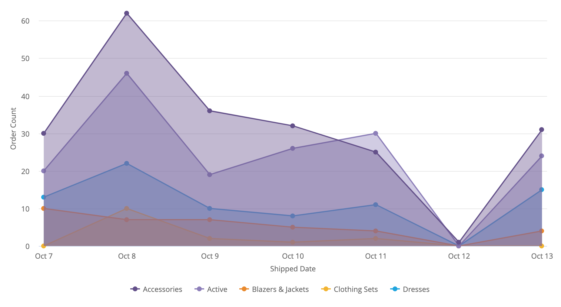 If multiple measures are specified, each measure becomes an x-axis series. If pivots are present, each pivot and measure combination becomes an x-axis series. If no measures are specified, two dimensions can be plotted.