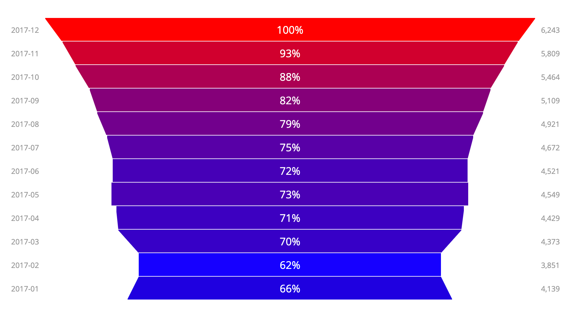 Elements of type: looker_funnel are composed from a single set of numbers and a single set of labels, defined using the dimensions and measures parameters.