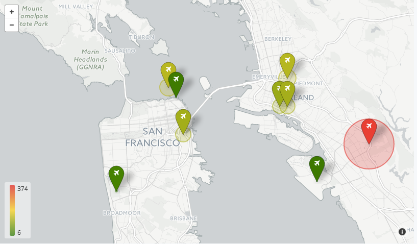 Elements of type: looker_geo_coordinates are useful for plotting data that is represented by points. To plot regions, use looker_geo_choropleth. Coordinates maps plot a single measure and a single dimension of type: location or type: zipcode. Additional dimensions will show in the tooltip when you hold the pointer over the data point.