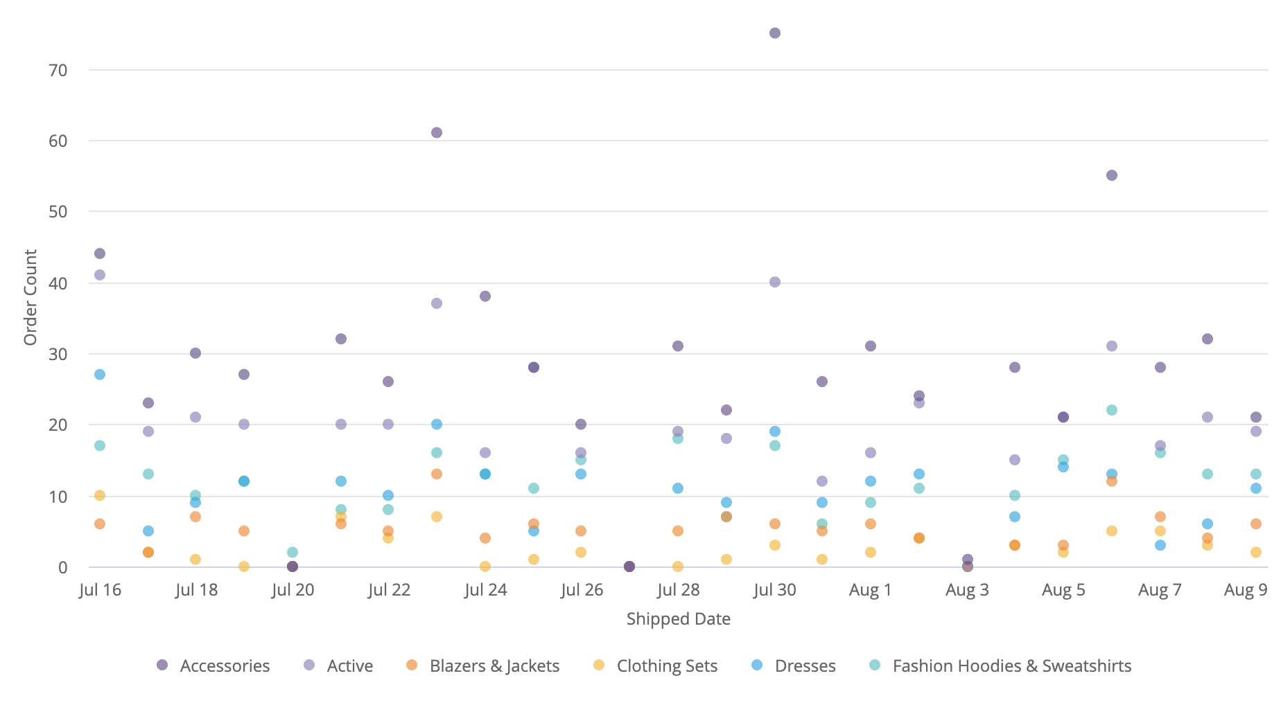 If multiple measures are specified, each measure becomes a y-axis series. If pivots are present, each pivot and measure combination becomes a y-axis series. If no measures are specified, two dimensions can be plotted.
