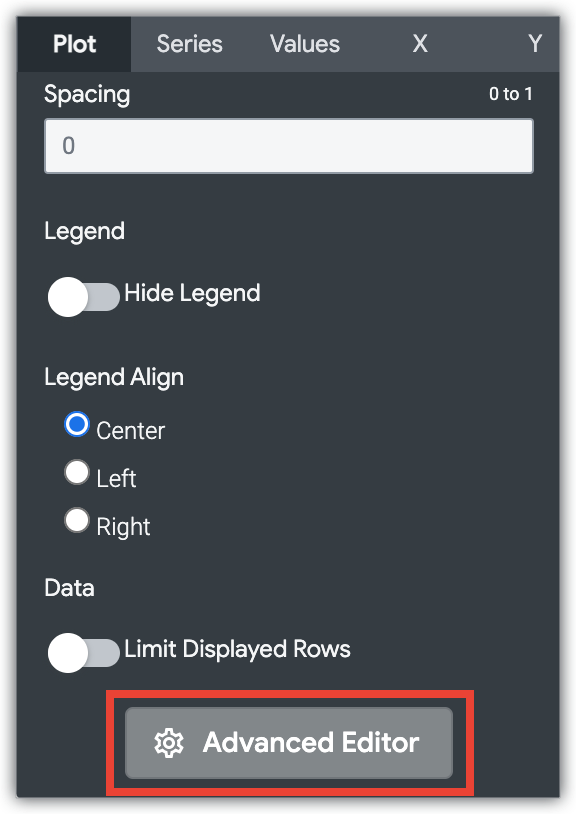 The Edit Chart Config button at the bottom of the visualization menu opens the Chart Config Editor. This editor lets you modify HighCharts visualizations by exposing certain JSON parameters of the visualization, enabling deep customization. These customizations will not dynamically interact with data.