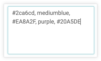 To change a selected color, or edit all colors at once, input hex strings, such as #2ca6cd, or CSS color names, such as mediumblue, into the color value box at the bottom of the picker.