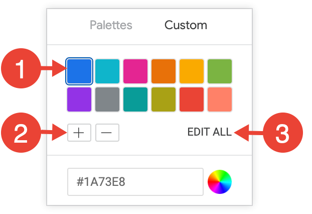 To create a custom color palette, select the Custom tab on the palette picker. You can edit your palette in several ways: