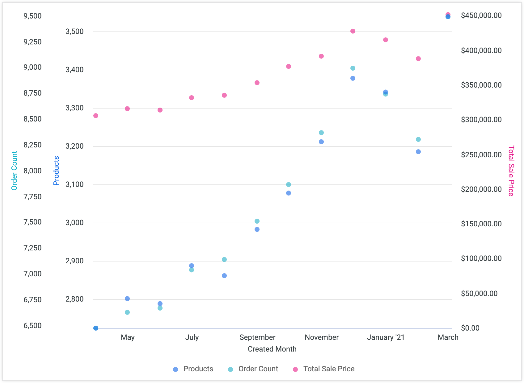 The Cluster Points option lets you group many data values into blocks. This can help improve the readability of your visualization when your data appears in high-density groupings. The number displayed for each cluster represents the number of individual data points that cluster contains, and the sizes of the individual clusters vary based on the size of the visualization in your browser or on a dashboard.