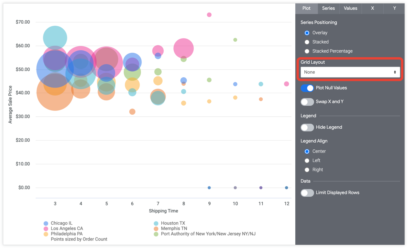 - Overlay: For scatterplot, line, and area charts. Series are overlaid on the chart.