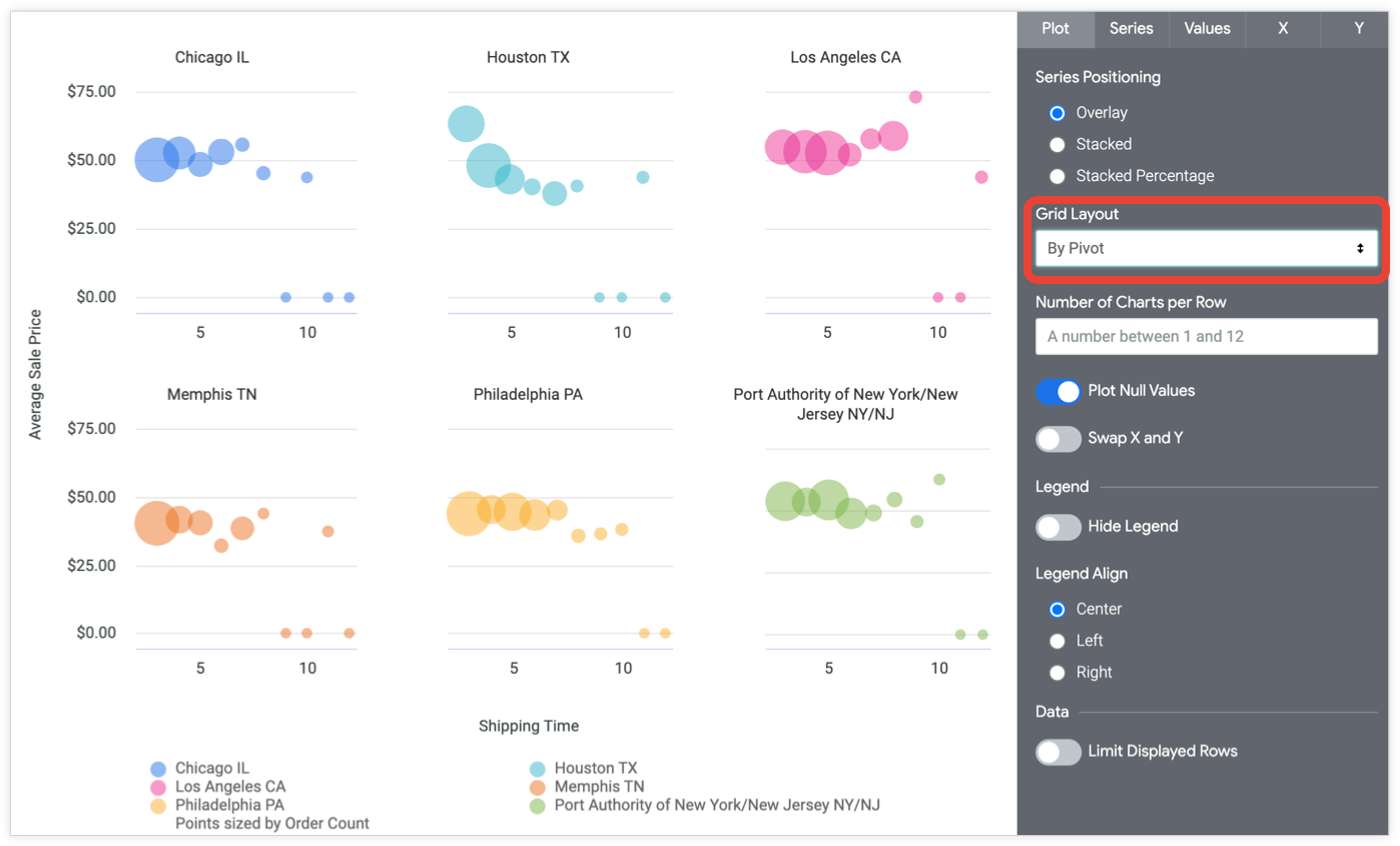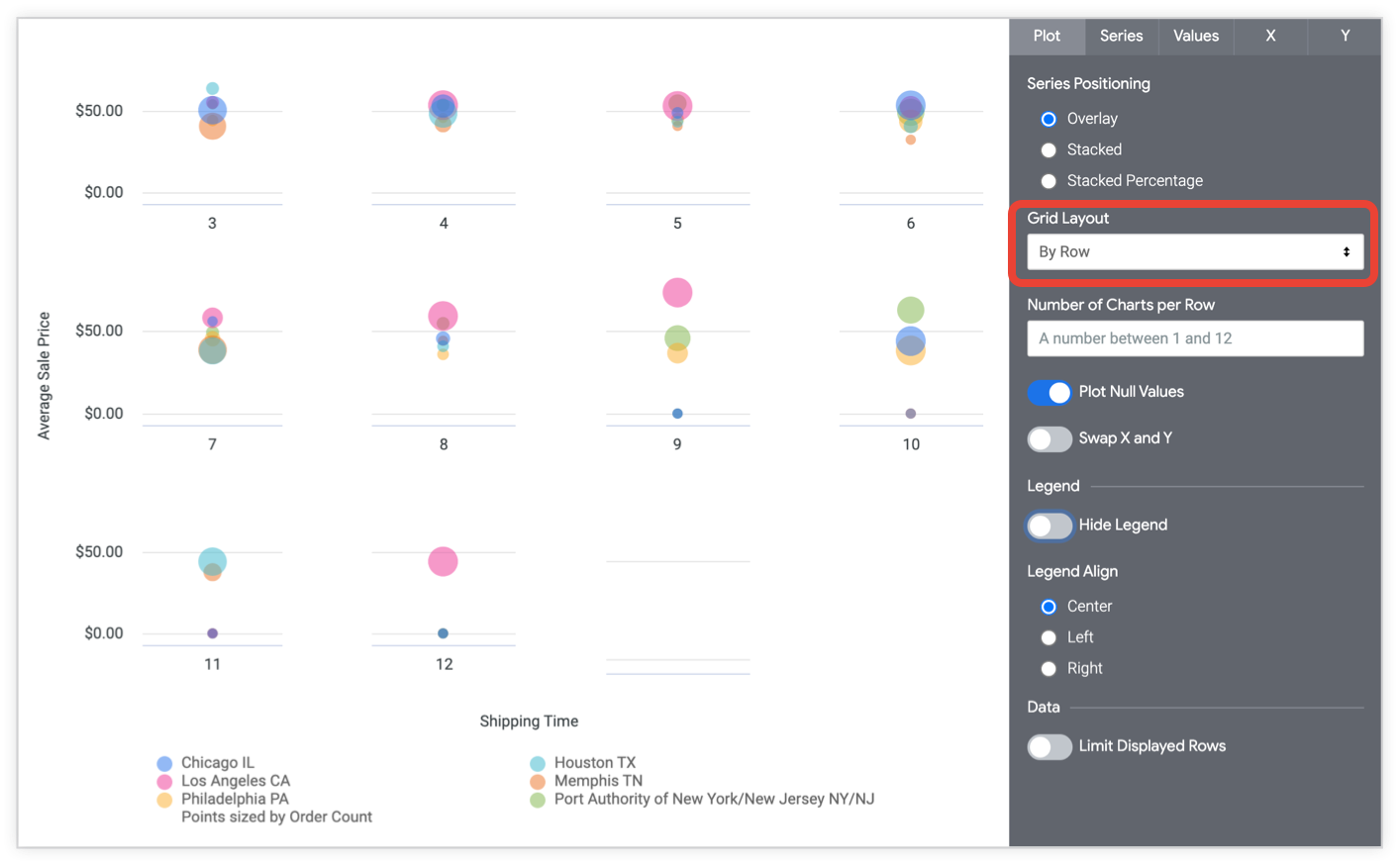 When you select By Pivot or By Row from the drop-down menu, the Number of Charts per Row option appears. You can input a number between 1 and 12. If you do not input a number, Looker arranges the charts as evenly as possible.