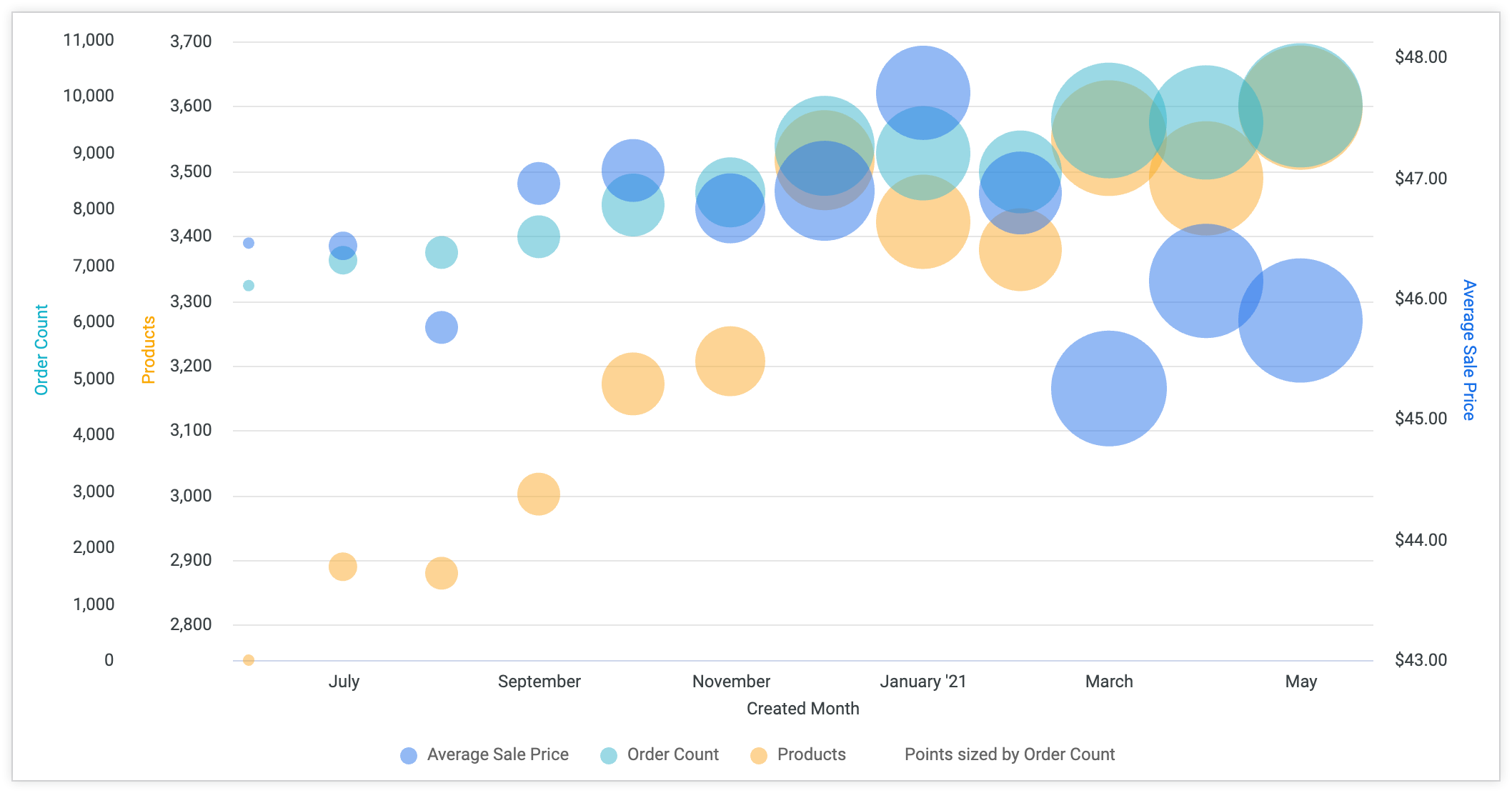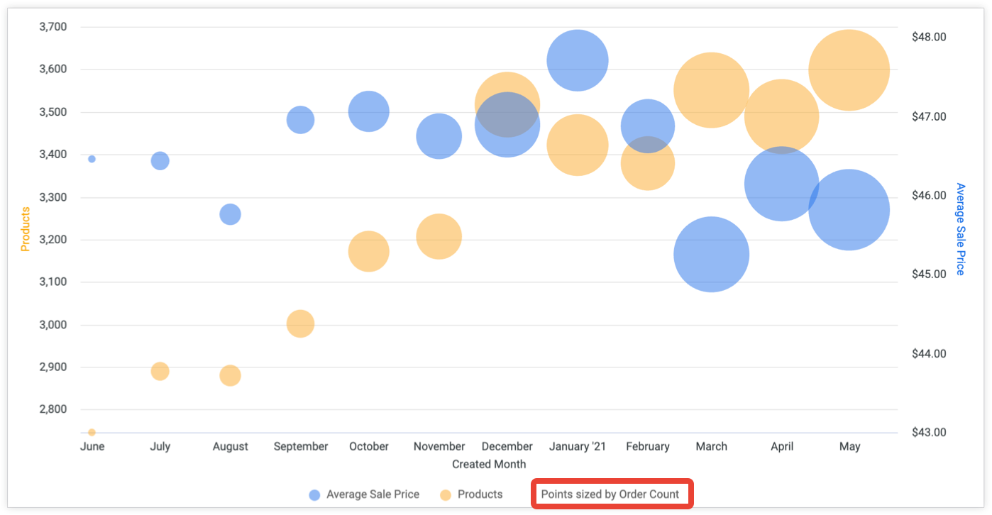 The Plot Size-By Field switch appears when a field is selected in the Size Points by Field drop-down, and at least two measures are unhidden on your data. This switch determines whether the field used to size the points is also plotted separately. When it is off, which is the default setting, the field is not plotted. When it is on, additional points appear on the chart representing that field.
