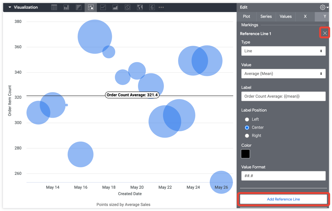 The Add Reference Line button enables the creation of reference lines in a chart. Click it as many times as you like to add any number of reference lines and reveal the settings for those reference lines. To delete a reference line, click the X in the upper right of its settings.