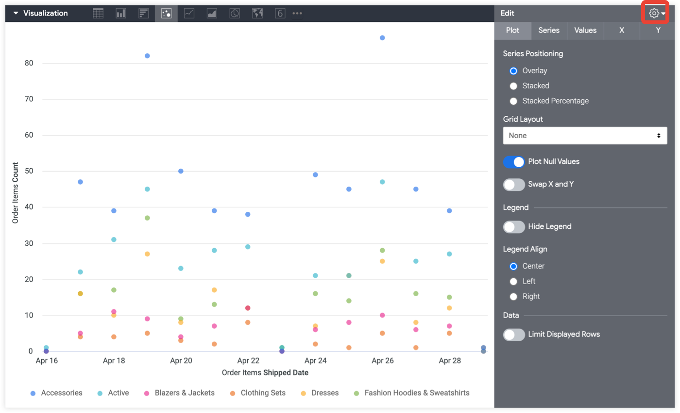 This page describes the options for editing scatterplot charts in the visualization menu. Select the Edit option in the upper right corner of the Visualization bar to format your visualization.