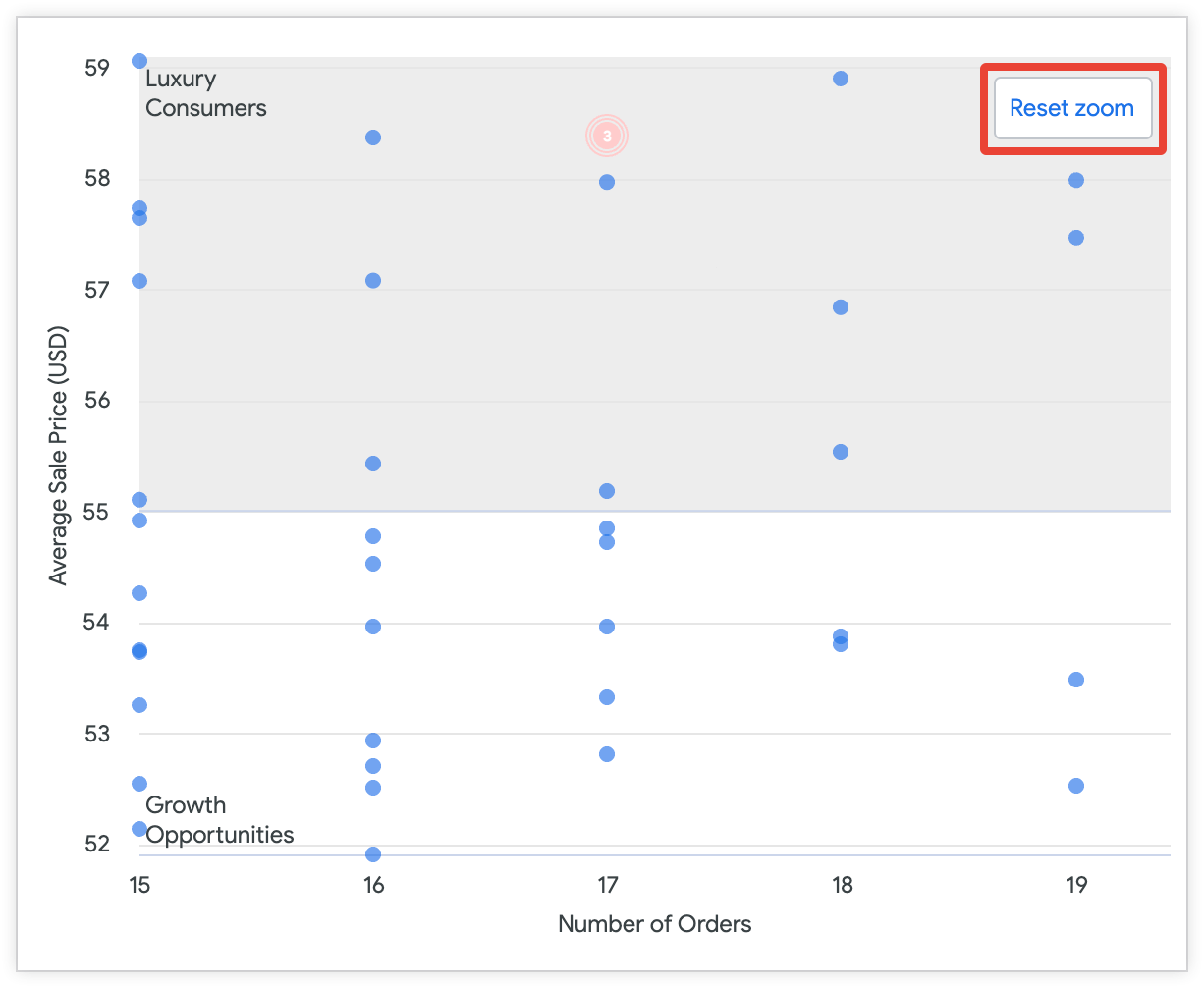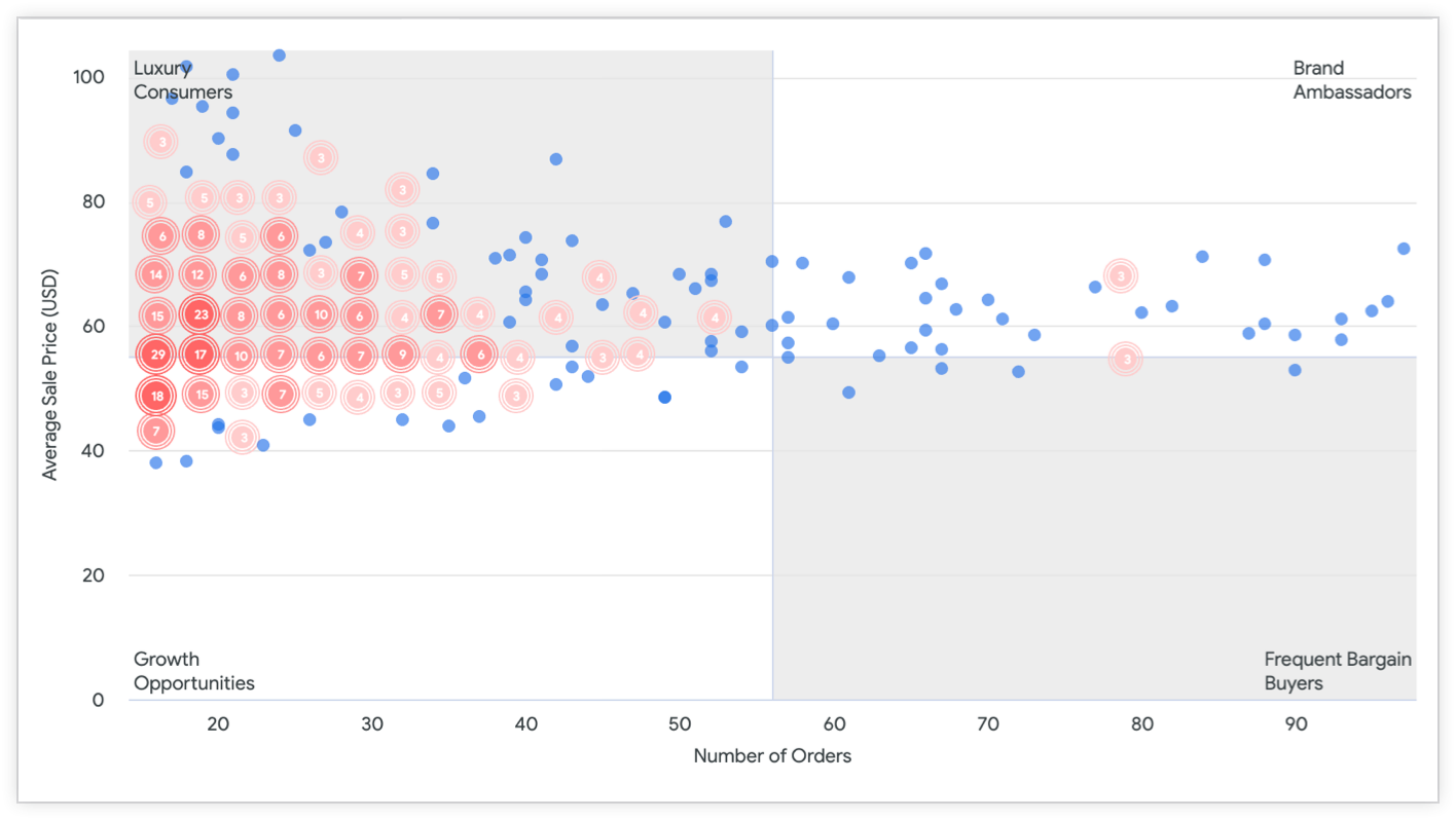 The Plot Quadrants option lets you divide a scatterplot chart into four quadrants. When you enable the Plot Quadrants option for a scatterplot visualization, you can customize the boundaries of each quadrant, as well as the background color and label for each quadrant. In the following example of a scatterplot chart, users are segmented based on the Number of Orders and Average Sale Price (USD) fields into the categories Luxury Consumers for the first quadrant, Brand Ambassadors for the second quadrant, Growth Opportunities for the third quadrant, and Frequent Bargain Buyers for the fourth quadrant.