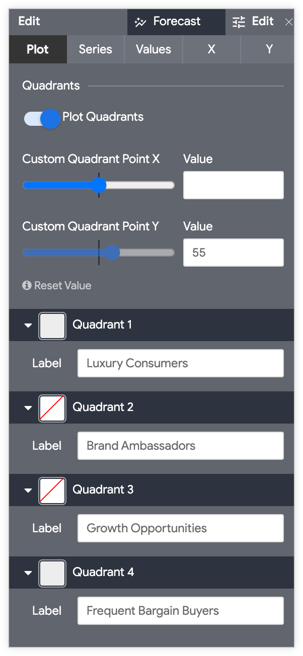 You can specify the following settings for a scatterplot chart that has Plot Quadrants enabled: