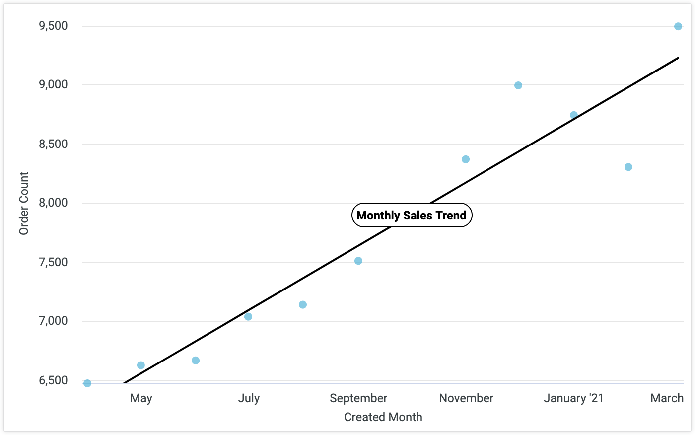 y = a * x^bwherebis slope (gradient) andais the y-intercept (the x value where the line crosses the y-axis).Polynomial: A polynomial trend line plots the y-variable as a polynomial function of the given order and x-value. Polynomial trend lines require you to enter the desired order of the polynomial to compute. Looker defaults to an order of 3.