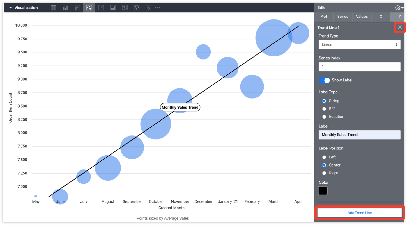 Click the Add Trend Line button to add trend lines in your chart. Click it as many times as you like to add any number of trend lines and reveal the settings for those trend lines. To delete a trend line, click the X in the upper right of its settings.