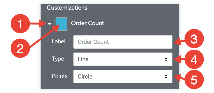 - Click the color swatch to select a custom color for the series. This overrides the color palette that's defined by the Colors option.