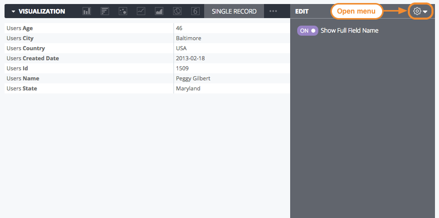 To select a single record chart, click the ellipses (...) on the Visualization menu bar and select Single Record. Click Edit in the upper right corner of the visualization tab to format your visualization.