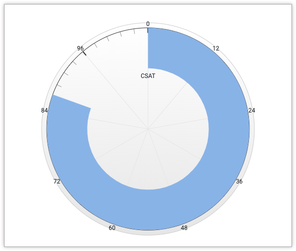 For example, the following solid gauge chart shows the current value of the Customer Satisfaction (CSAT) measure, which is represented by a circular blue progress bar. Since the possible values of CSAT scores can be from 0 to 100, those values are represented on either end of the gauge.