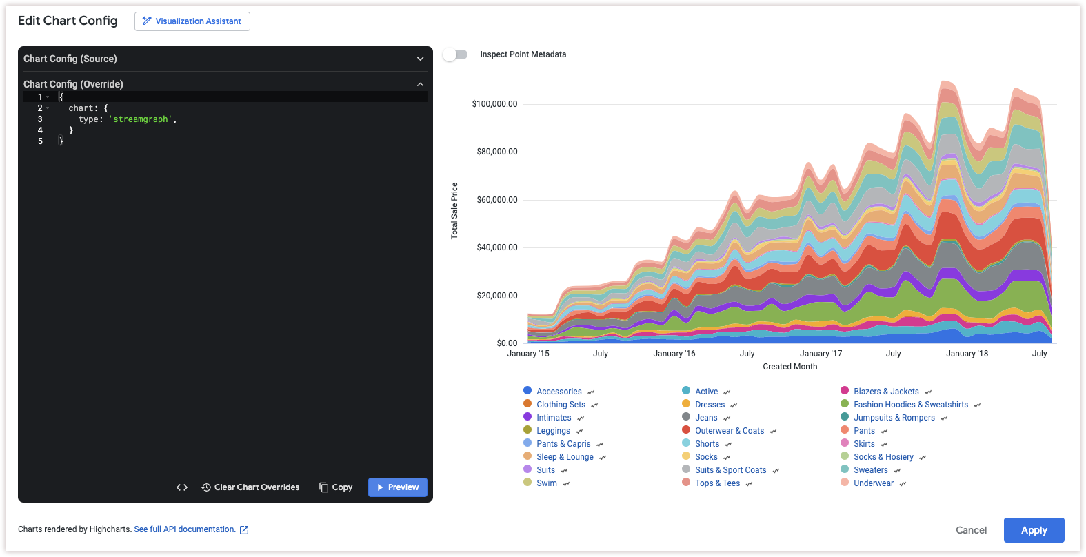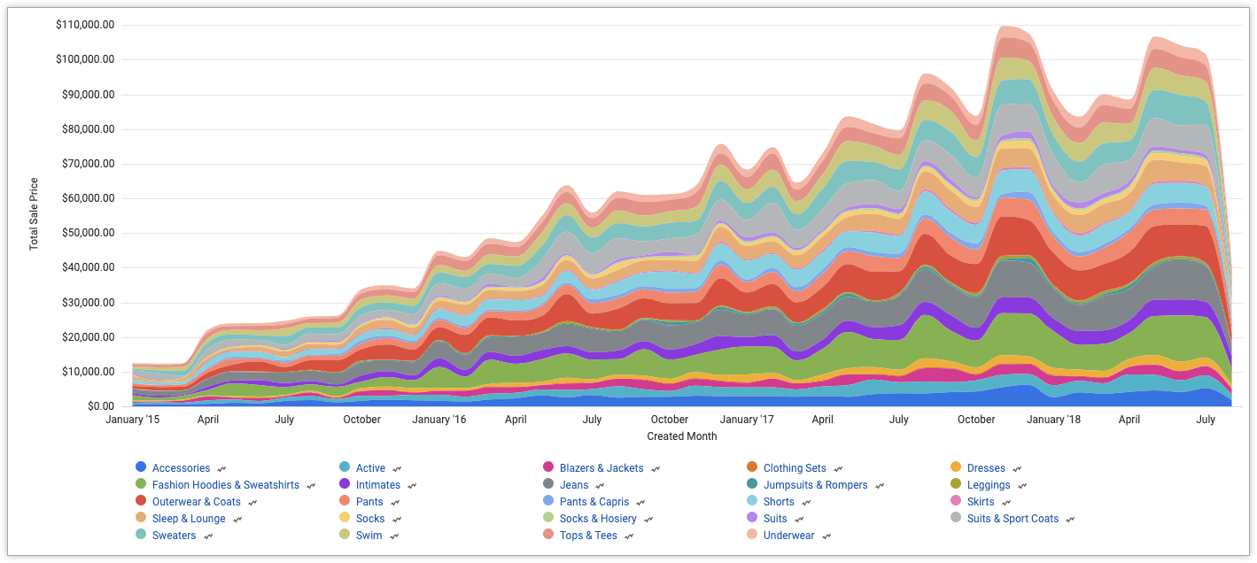 For example, the following streamgraph chart shows the Total Sale Price over several different Category values, plotted over Order Created Month. Categories are stacked on top of one another to show how much each category contributes to the total, as well as how the total changes over time.