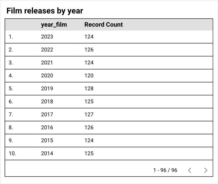 For example, a table chart called Film releases by year displays a Record Count metric that is grouped by a year_film dimension that represents the year that a film was released.