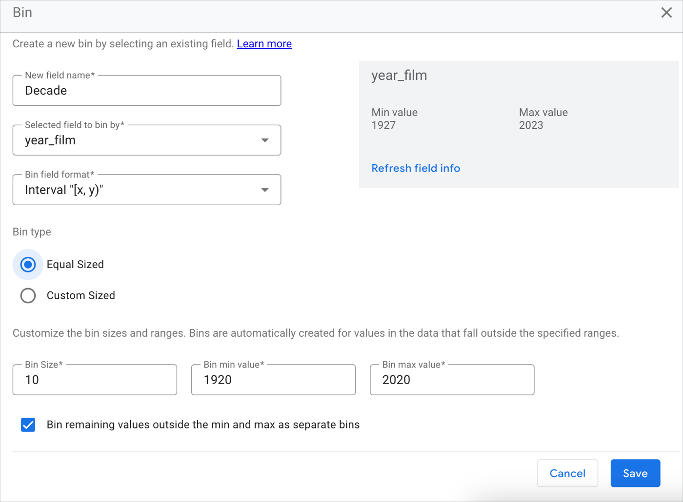 In the Bin min value, the report creator inputs 1920 to begin the bins at the earliest decade that a film was released in the dataset.