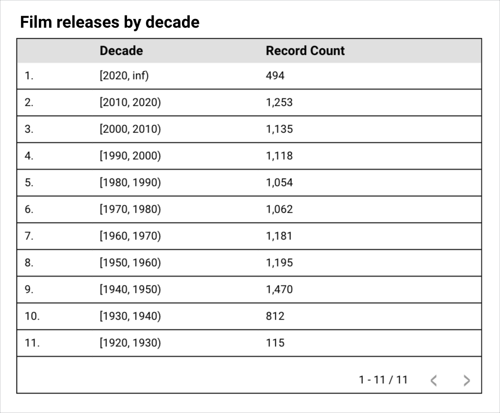The resulting table now displays the Record Count metric grouped by the new Decade bin field, to display the number of films that were released each decade.