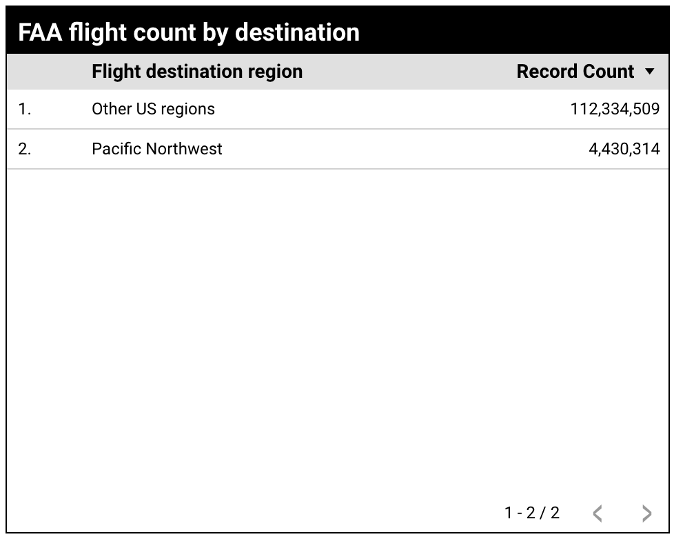 This table lets users quickly understand how many flight destinations were located in the Pacific Northwest region (4,430,314 flights), compared to other US regions (112,334,509 flights).