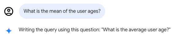 The questions don't need to be in a specific format or use a specific syntax. However, they do need to relate to the data source that you've selected. Conversational Analytics may rephrase your question after you've written a query, and the rephrased question will be displayed in the conversation window following your original question. For example, Conversational Analytics might rephrase the question "What is the mean of user ages?" to "What is the average user age?"