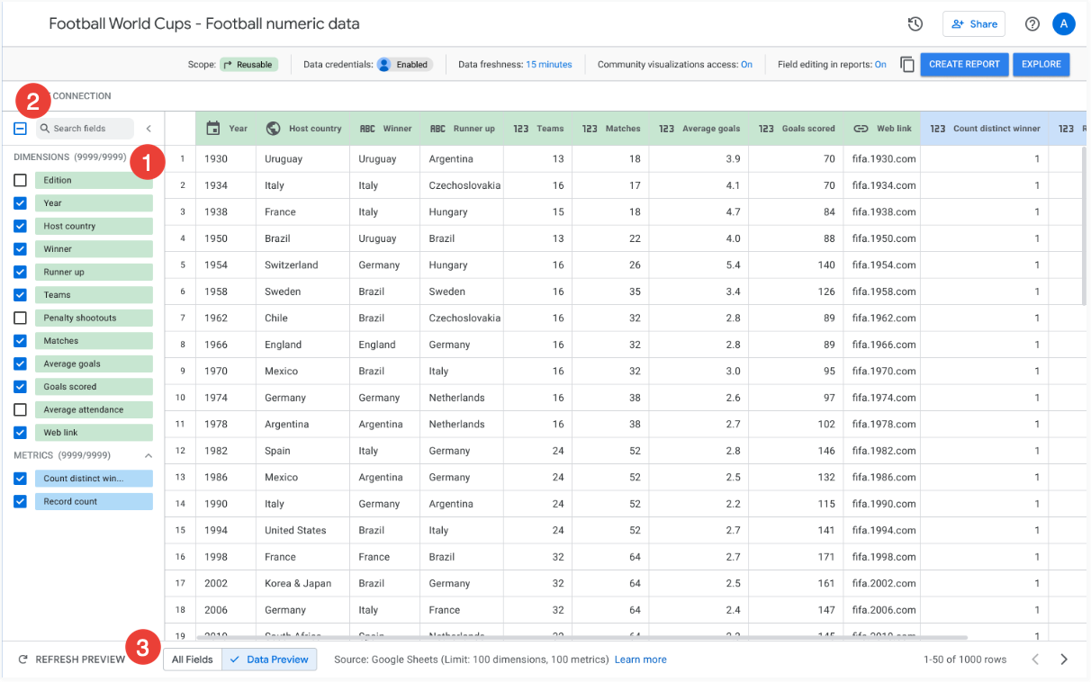 - When you create a new data source, Looker Studio automatically takes you to this page after you connect your data.