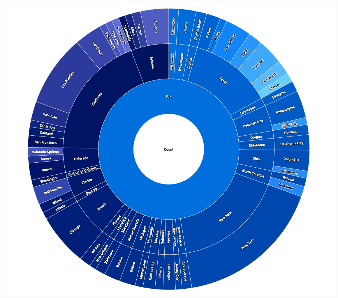 For example, you can create a sunburst chart that shows the Orders Count measure, broken down by the Users Country, Users State, and Users City dimensions. The size of each ring slice corresponds to the Orders Count .