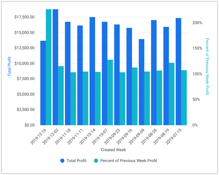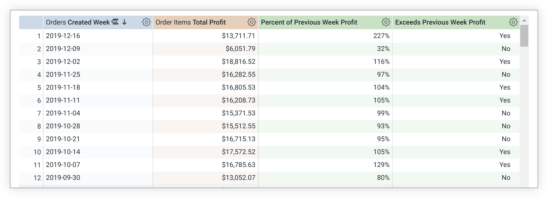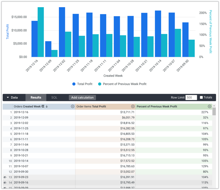 Note that the underlying data table includes the dimension Orders Created Week and the measure Order Items Total Profit, along with a table calculation called Percent of Previous Week Profit, which compares the profit of each week against the previous week: