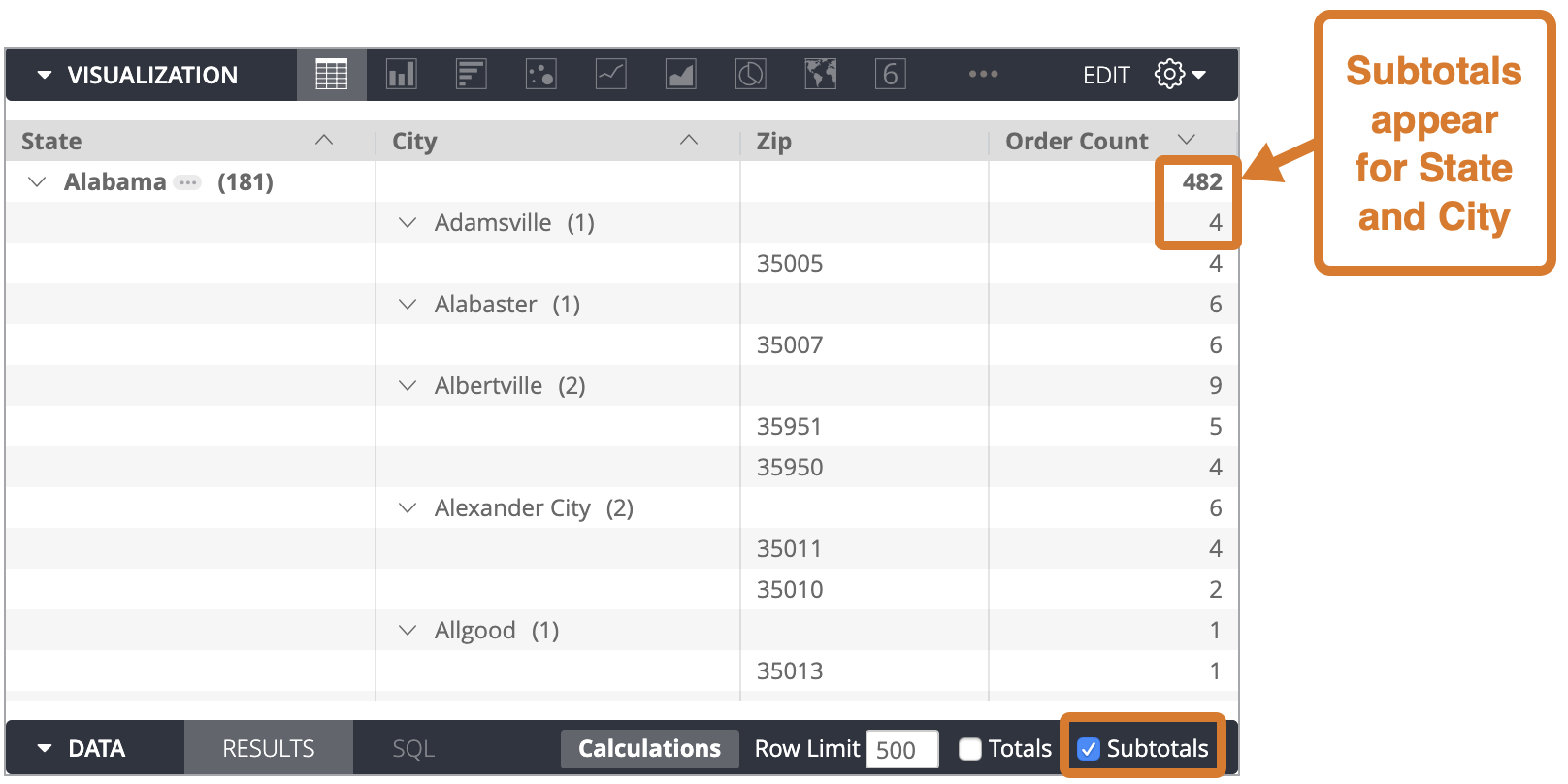 sql_always_havingparameter. - If your data table row limit cuts off your data table partway through a subtotal category, the entire category will be hidden from the table visualization.