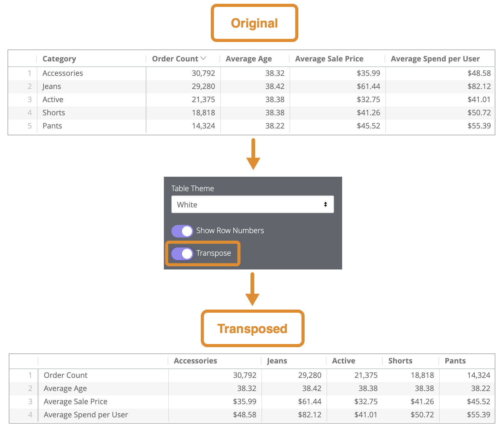 Size Columns to Fit sizes the widths of all columns so that the table perfectly fits the width of the pane in which you are viewing it. When this option is toggled on, columns can still be manually re-sized, and the manually set widths will override the widths set by Size Columns to Fit. Widths set using the Size Columns to Fit option are saved when you save your visualization as a Look or add it to a dashboard.