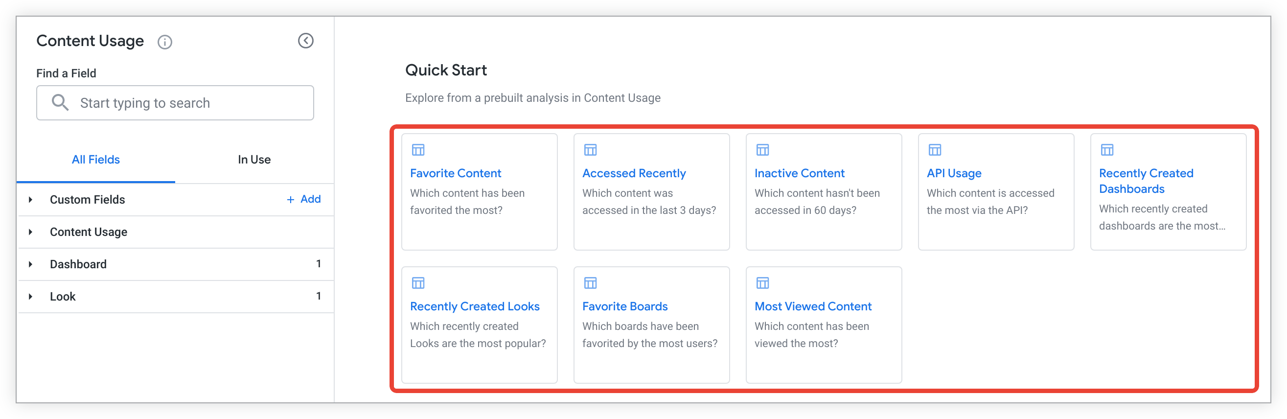 The Content Usage Explore includes Quick Start analyses, which you can use to quickly answer questions or as starting points for other queries.