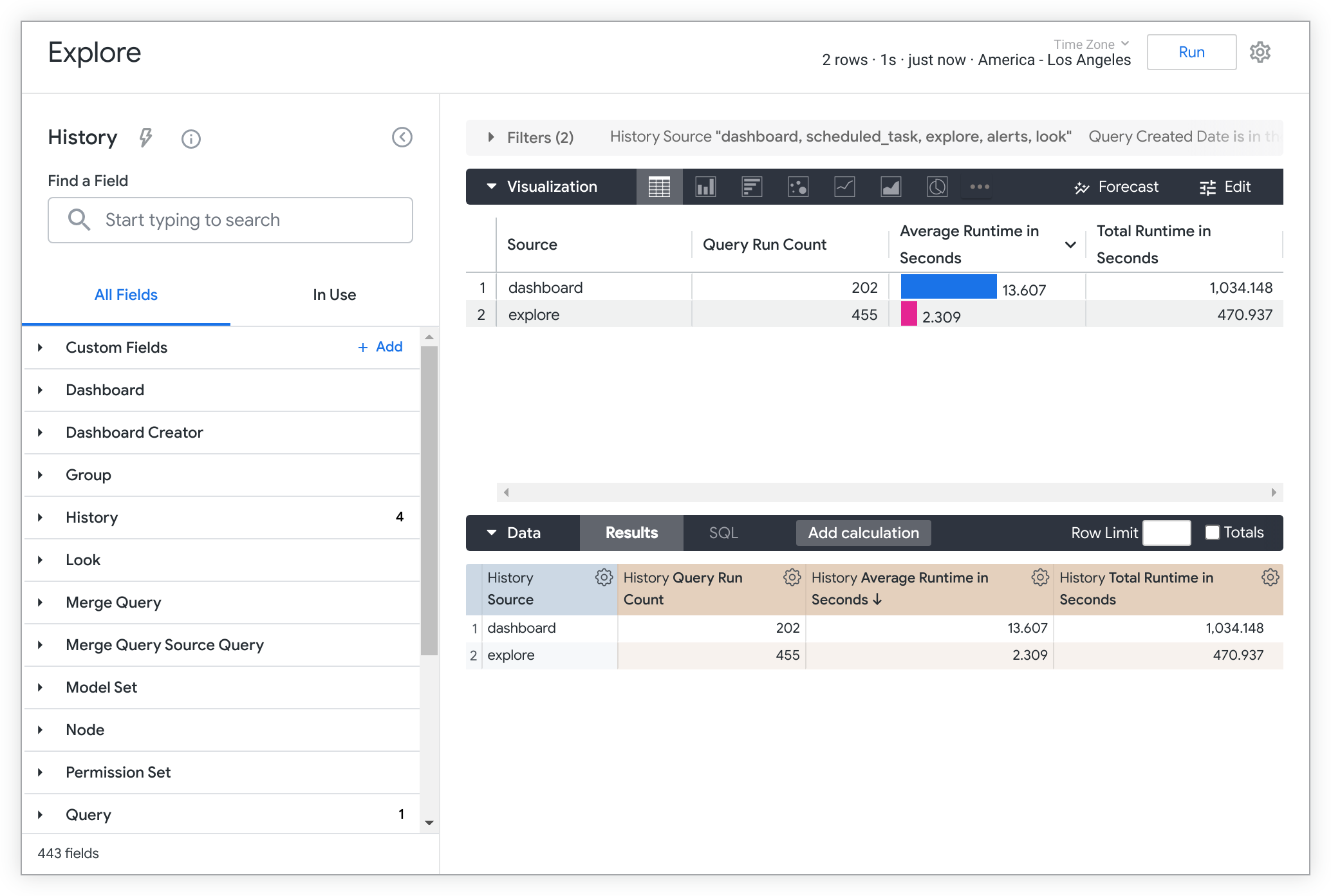 | Content Usage | Data about Look and dashboard usage, including frequency of views, favoriting, scheduling, embedding, and access through the API. Also includes details about individual Looks and dashboards. | 12 hours | |