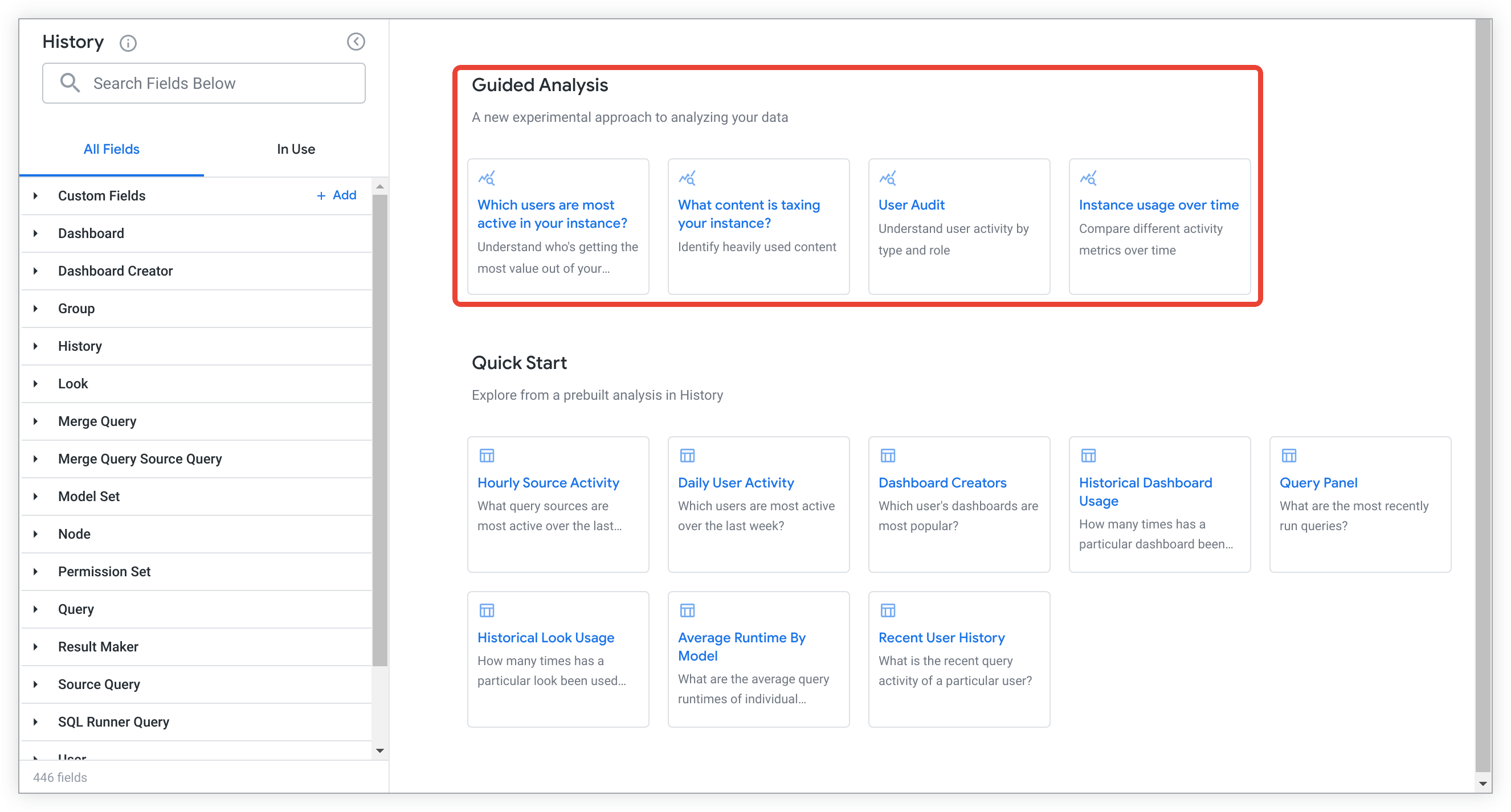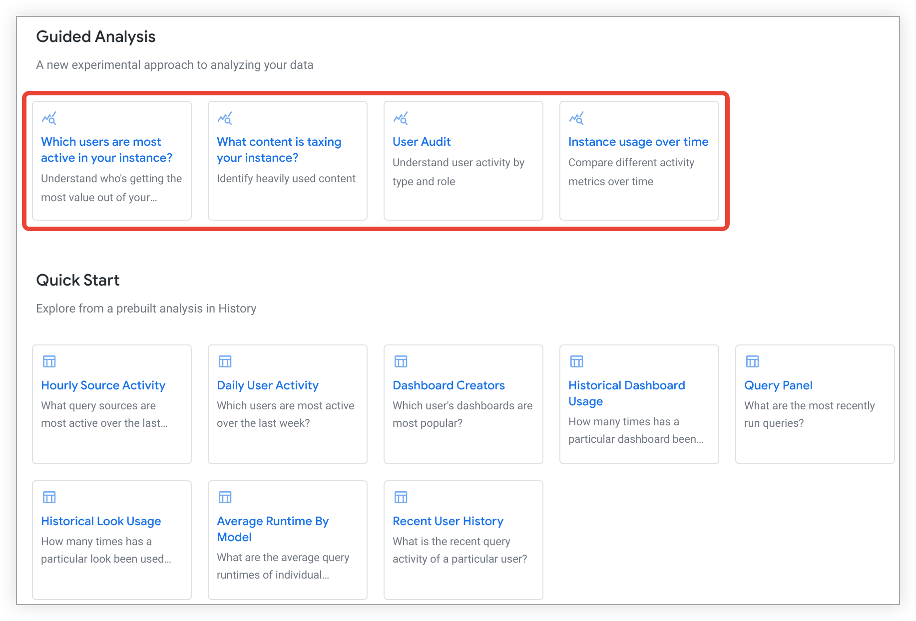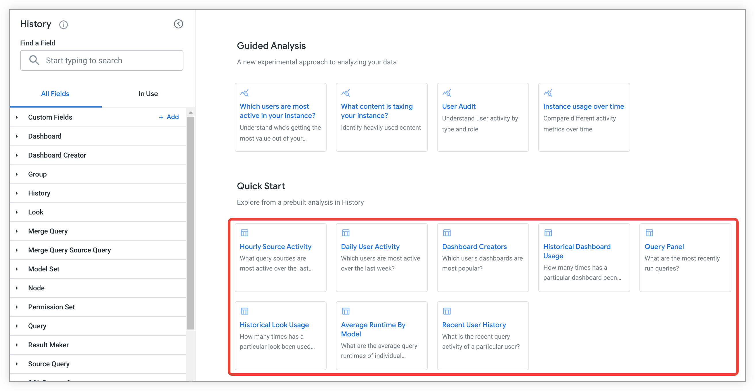 Guided analyses let Looker admins and users who have been granted the see_system_activity permission quickly answer key questions about instance usage in the History Explore with a question-and-answer format. For users to be able to access guided analyses, an admin must enable the Guided analyses in System Activity Labs feature.