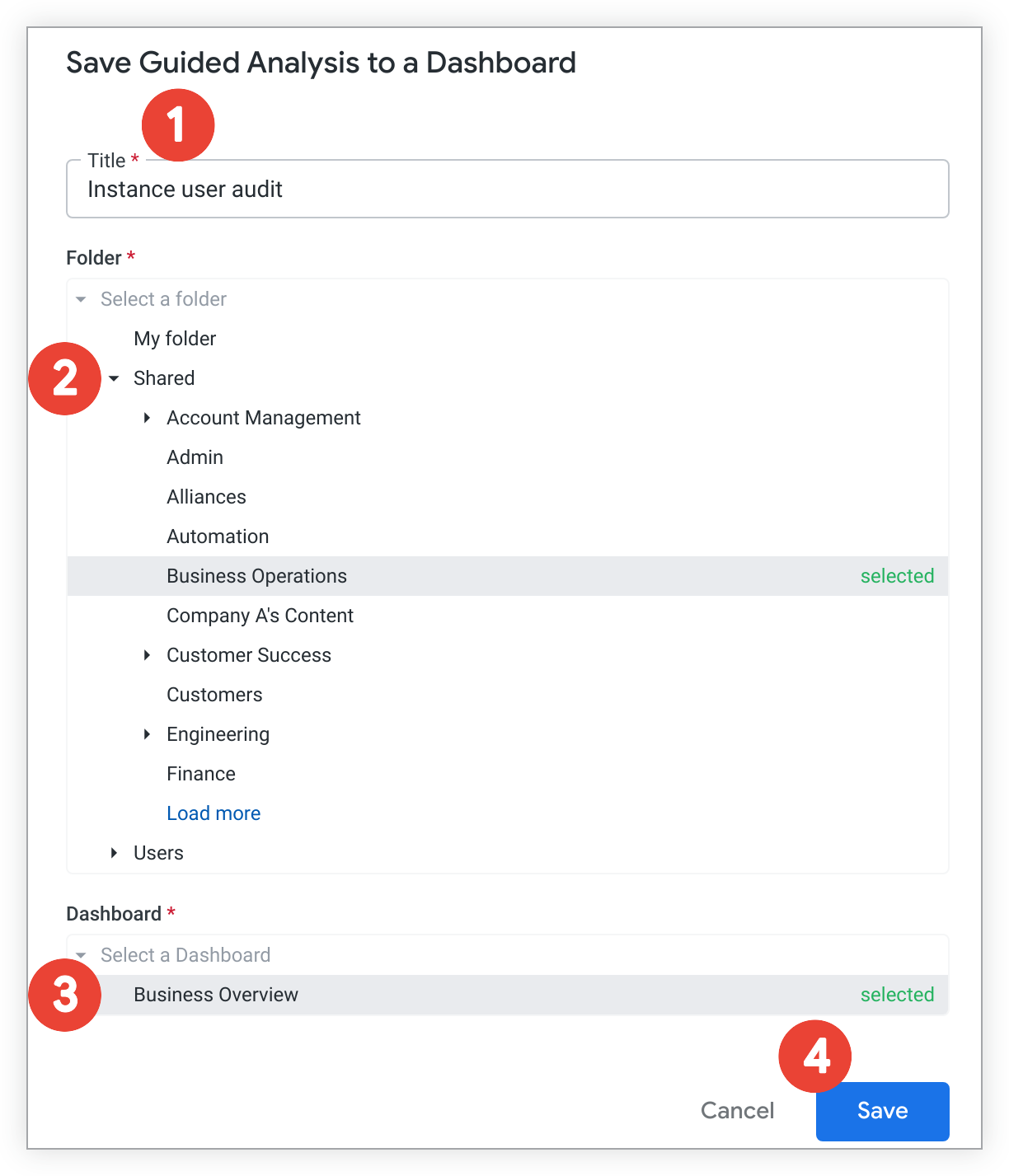 Once the Save Guided Analysis to a Dashboard menu opens, follow these steps:
