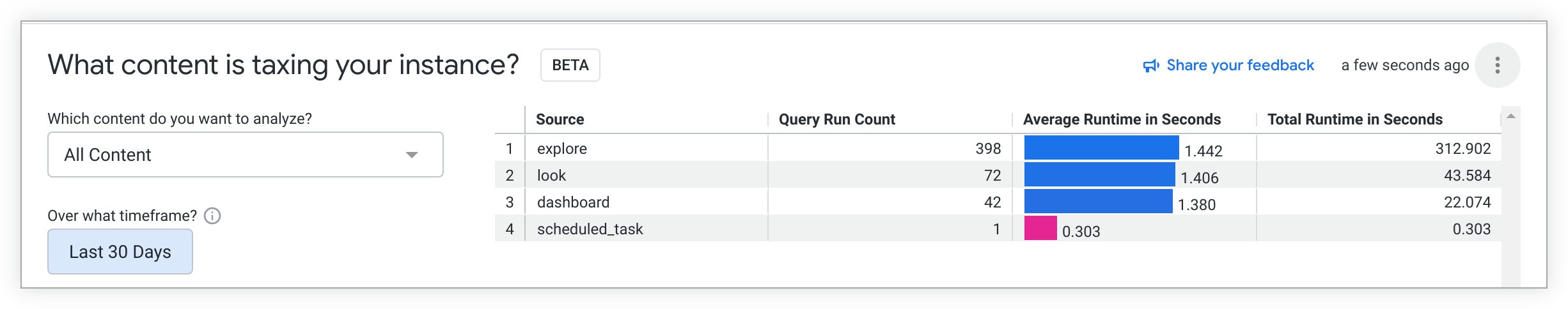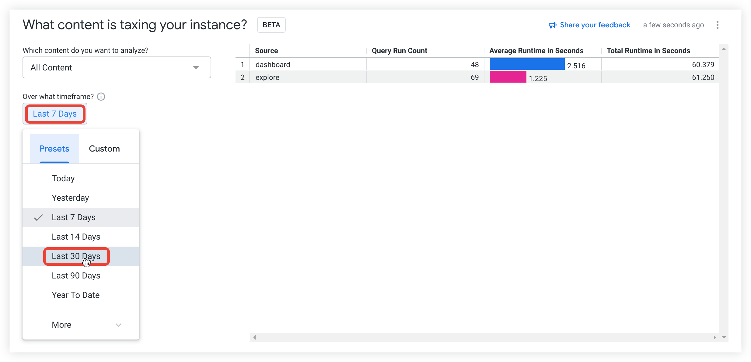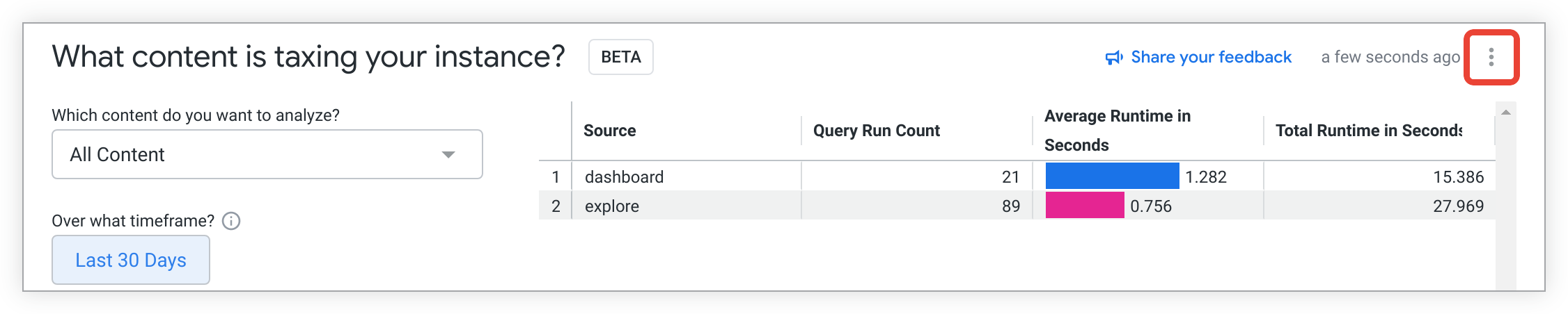 For example, you can select the What content is taxing your instance? analysis to identify heavily used content on your Looker instance. After the guided analysis has loaded, you can change the default timeframe value in Over what timeframe? to Last 30 days.