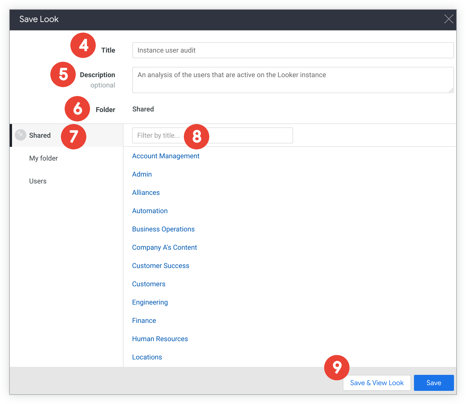 If you want to save over an existing Look, navigate through the list of Looks or use the Filter by title field to find and select the Look that you want. The Look's title and description (if any) appear in the Title and Description fields.