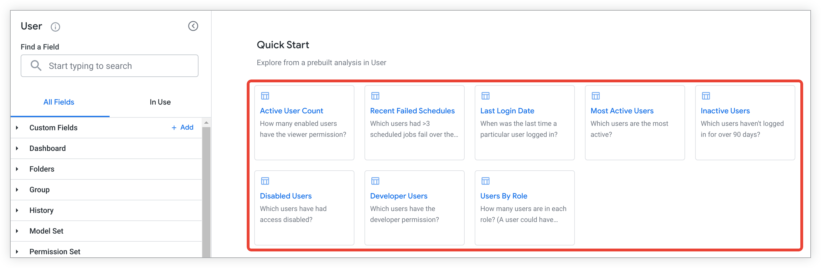 The User Explore includes Quick Start analyses, which you can use to quickly answer questions or as starting points for other queries.