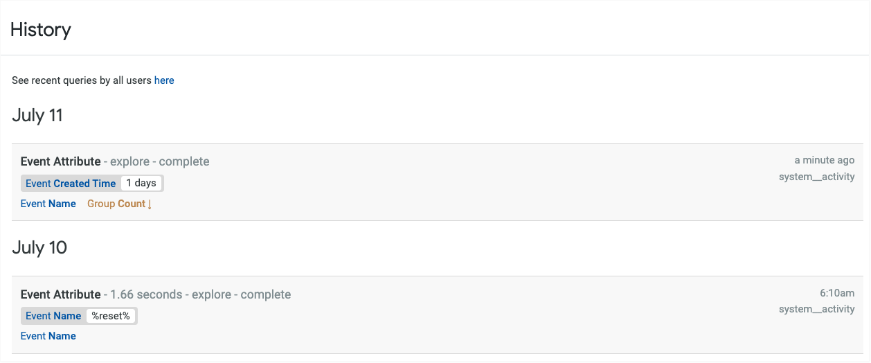 The History page will show the 100 most recent queries. To view more results, Looker admins and users who have been granted the see_system_activity permission may use the History Explore in System Activity.