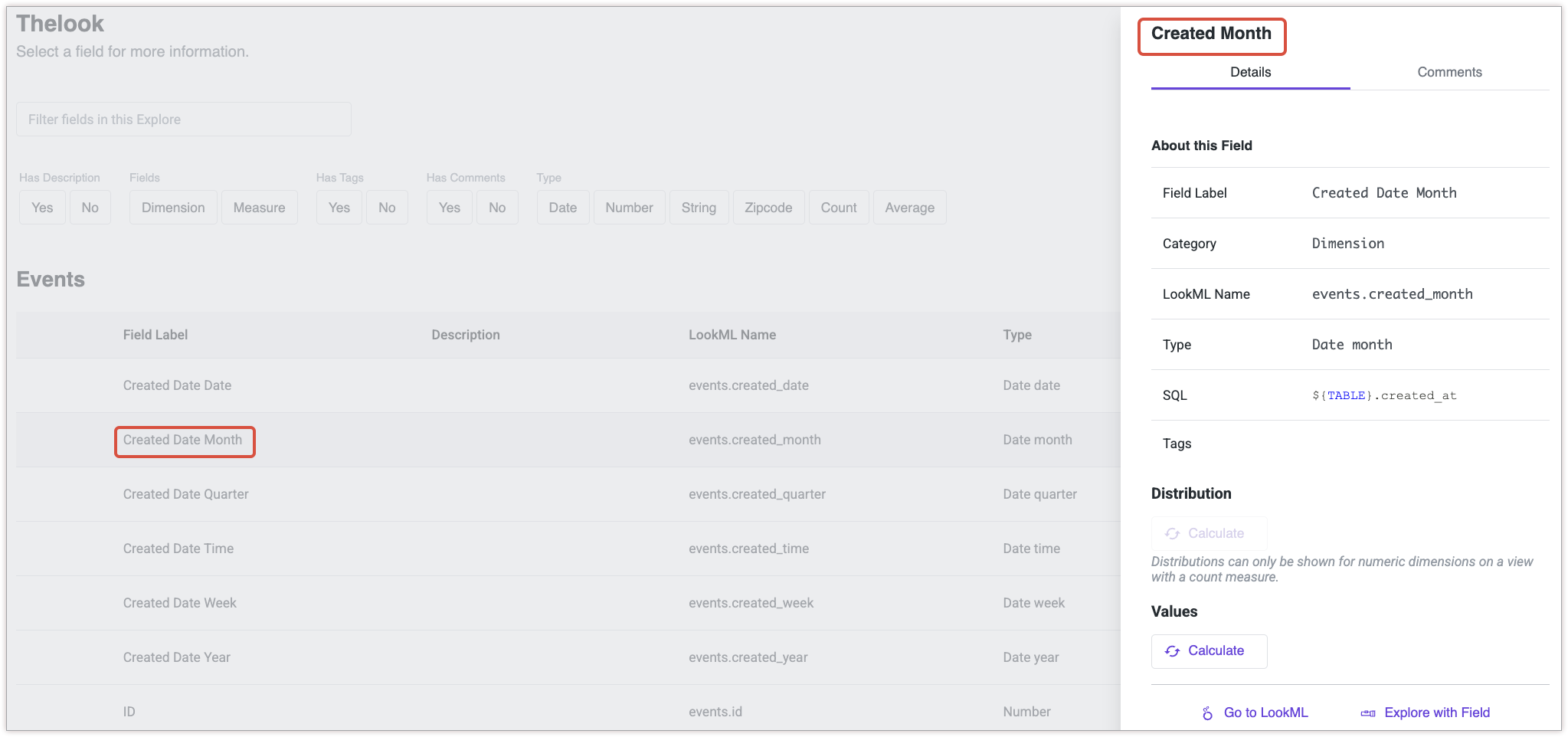 If you're using version 2.0.0 or later of the Looker Data Dictionary extension, the field profiler opens by default to the Details tab.