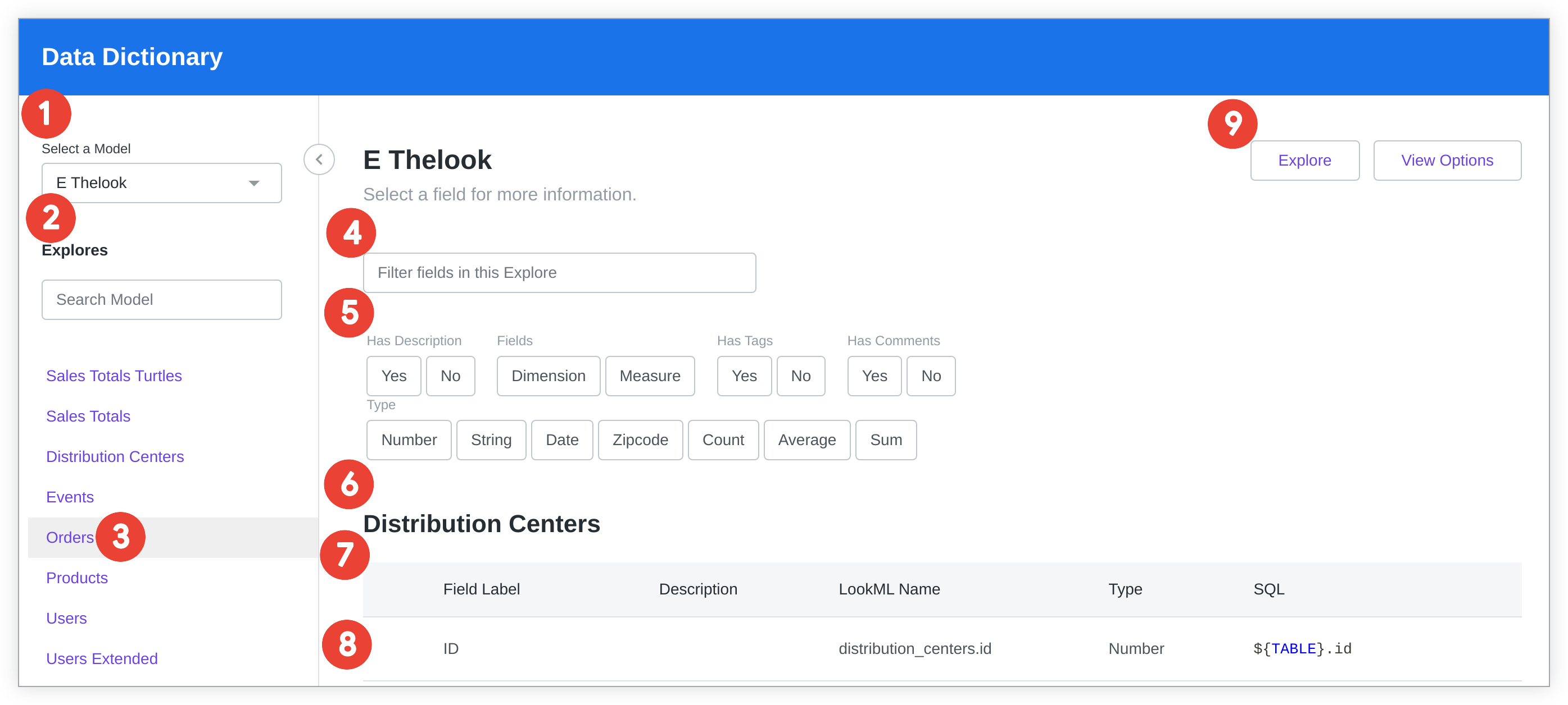 The Looker Data Dictionary extension provides a dedicated, centralized interface for searching through all your Looker fields and descriptions. Use this extension to perform these tasks: