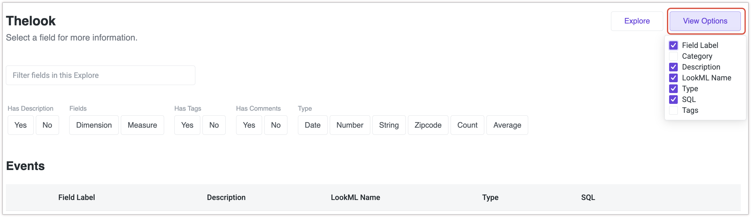 Select the name of an Explore to see its fields, grouped by view, displayed on the main part of the page.