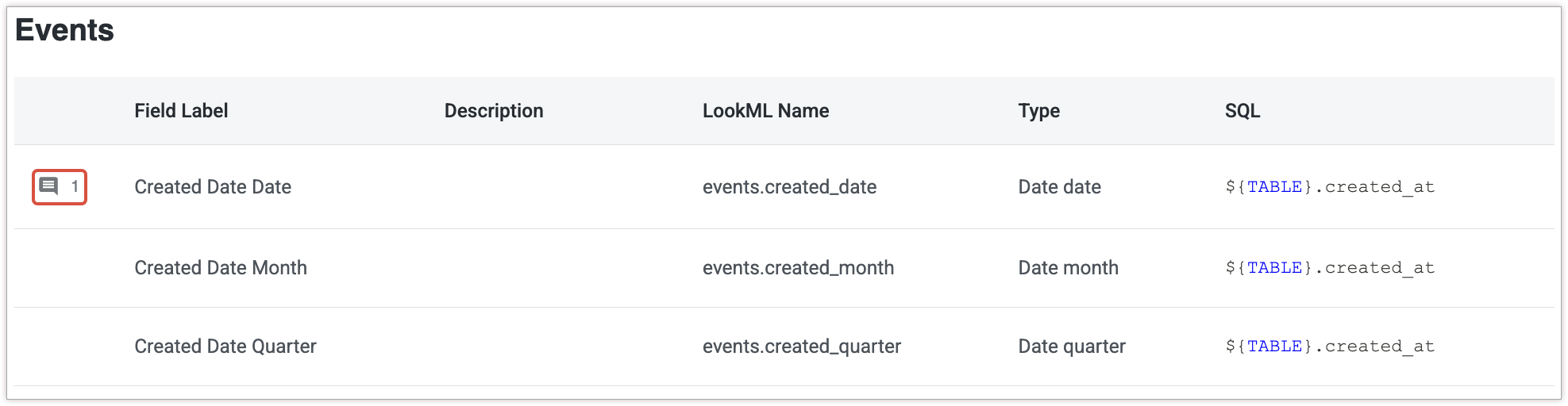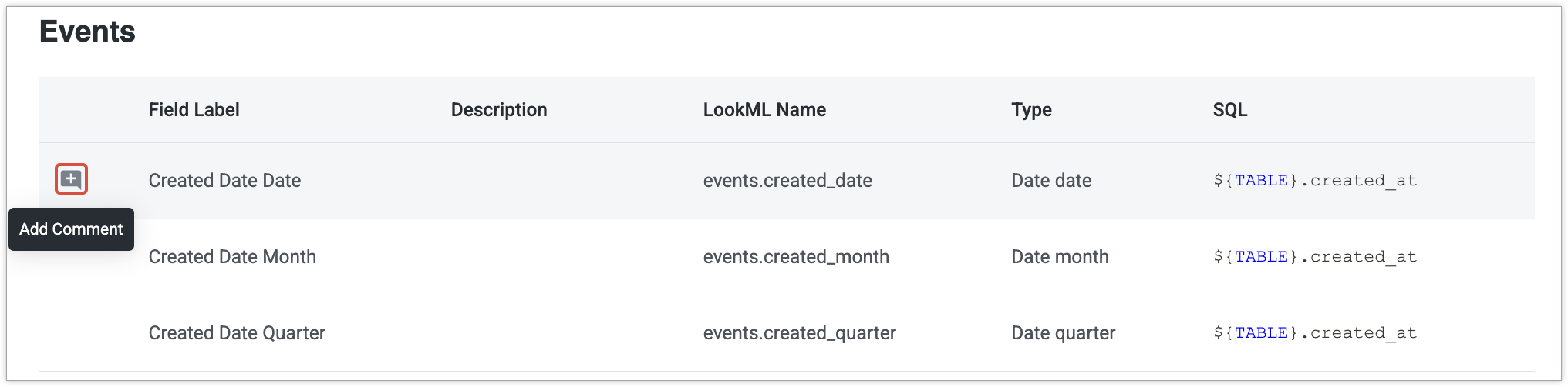 LookML developers often include additional information or explanations about a model's fields in the field-level description parameter. However, these descriptions are not always meaningful or useful to all users. With field-level comments, users can add context to a specific field. These comments are viewable by other users but will not affect the model's underlying LookML.