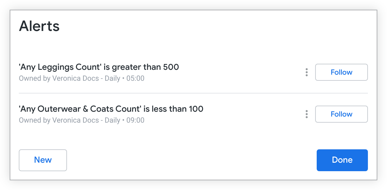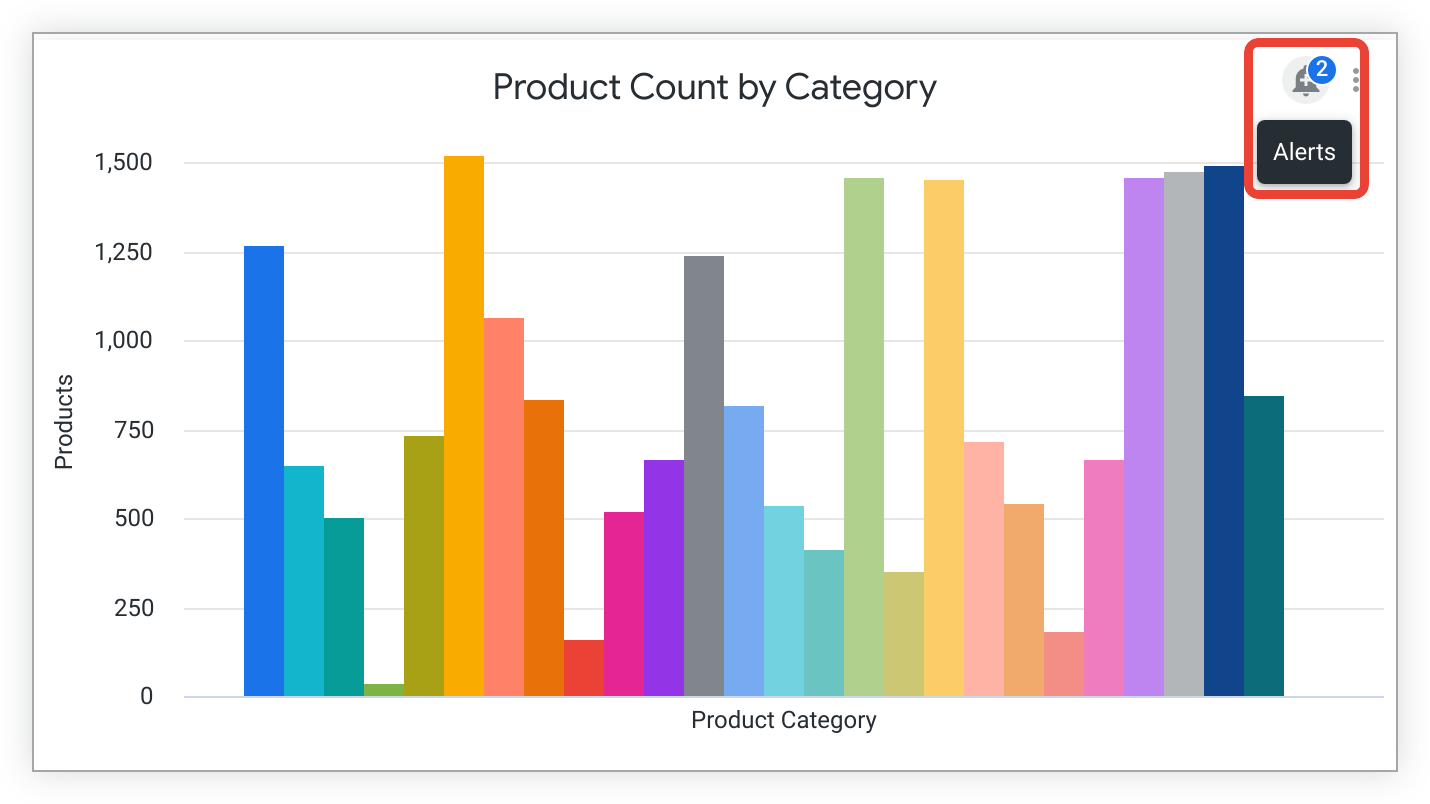If your Looker admin has granted you permissions to create or follow alerts, the add_alert Alerts icon appears when you hold your pointer over the dashboard tile. A numeric indicator shows how many alerts you're permitted to view for that tile, even alerts that don't include you as a recipient and that you aren't following.