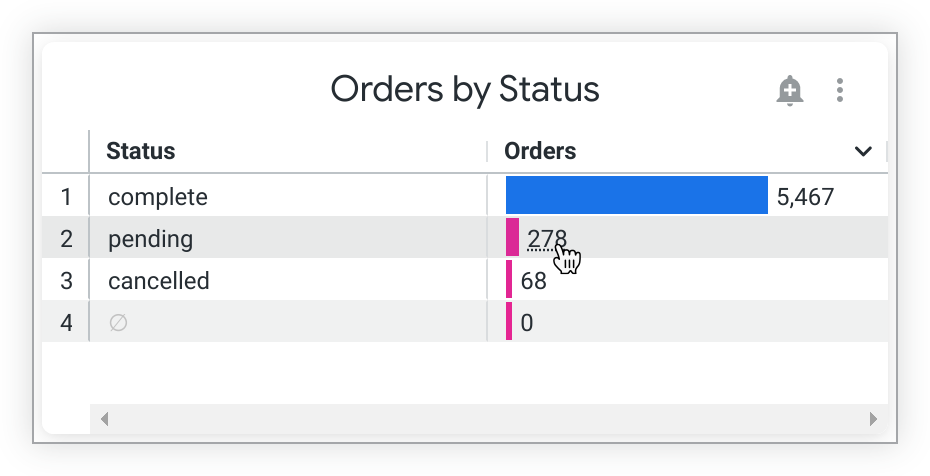 To go deeper, click on a region or data point. Depending on the underlying data, a drill overlay may open automatically, allowing you to drill down into that data point. (In table visualizations, data points that you can drill into show a dotted underscore when you hover over them.) For example, consider a tile displaying an Orders measure grouped by a Status dimension in a table visualization.