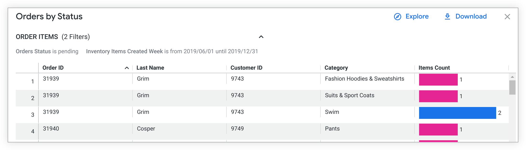 If you click on the Orders measure value in the row where Status has a value of pending, a drill overlay appears that gives you information about all the orders that are pending. The overlay also displays any filters applied, either from the original tile query or as a result of your click.