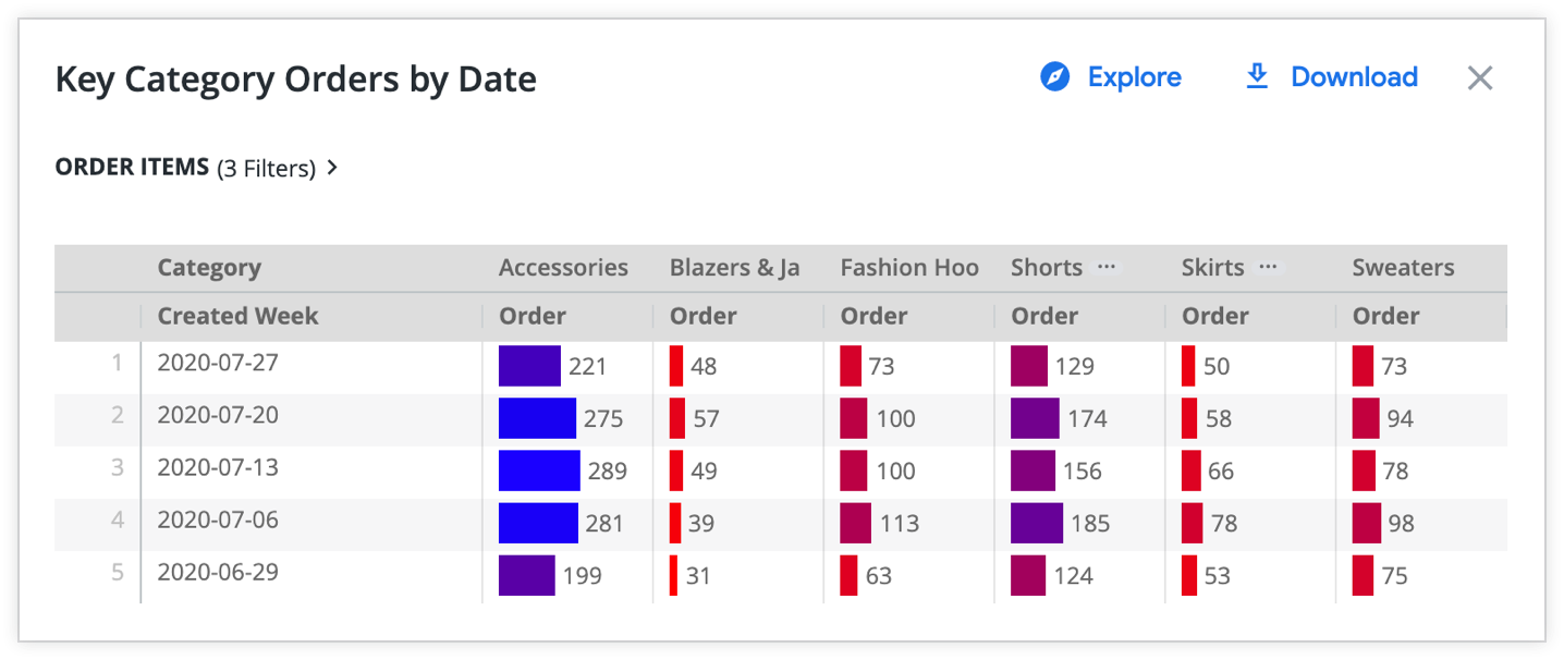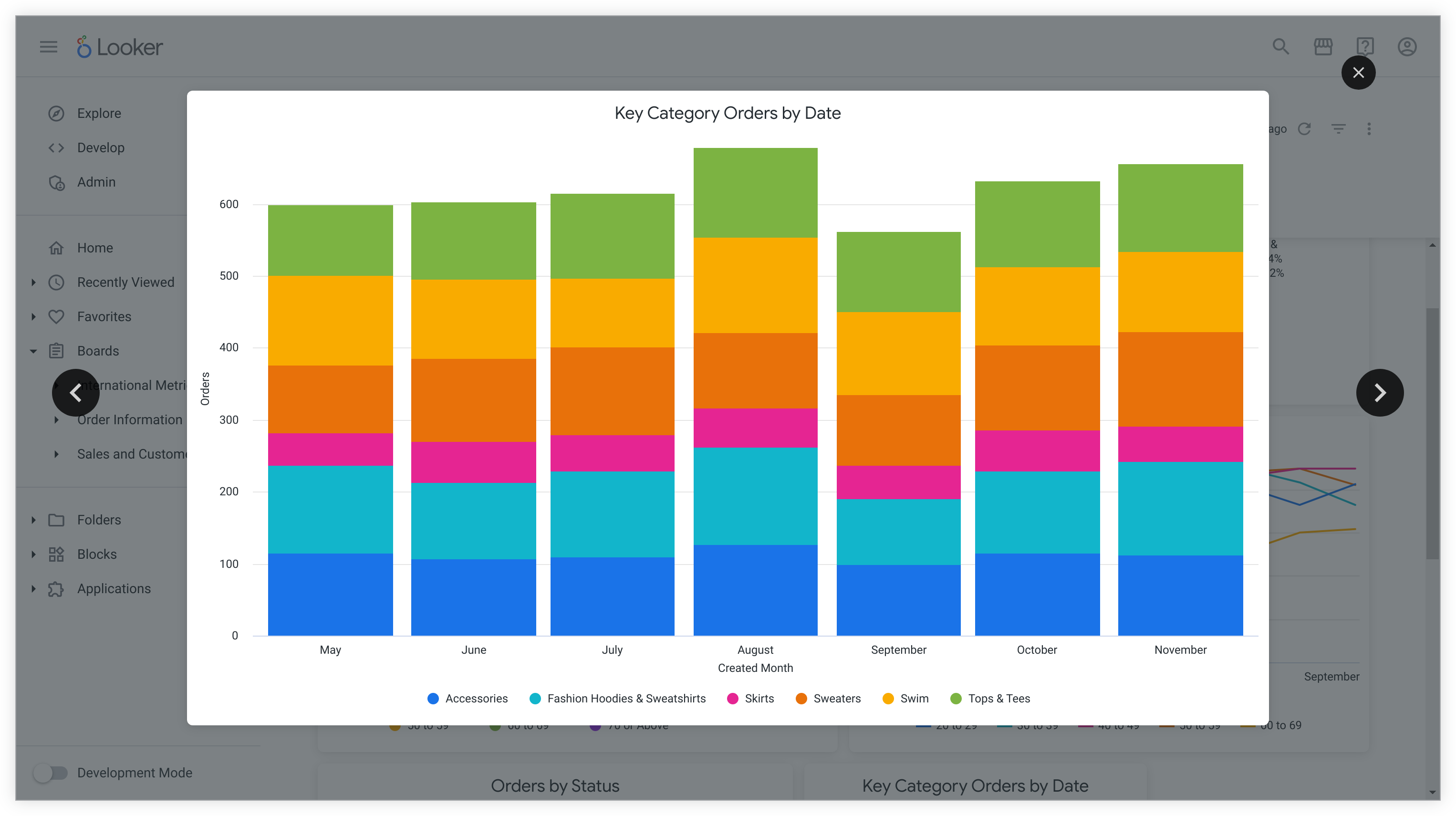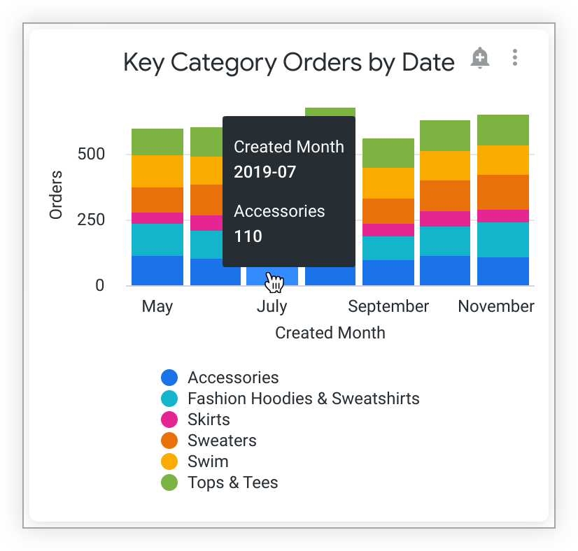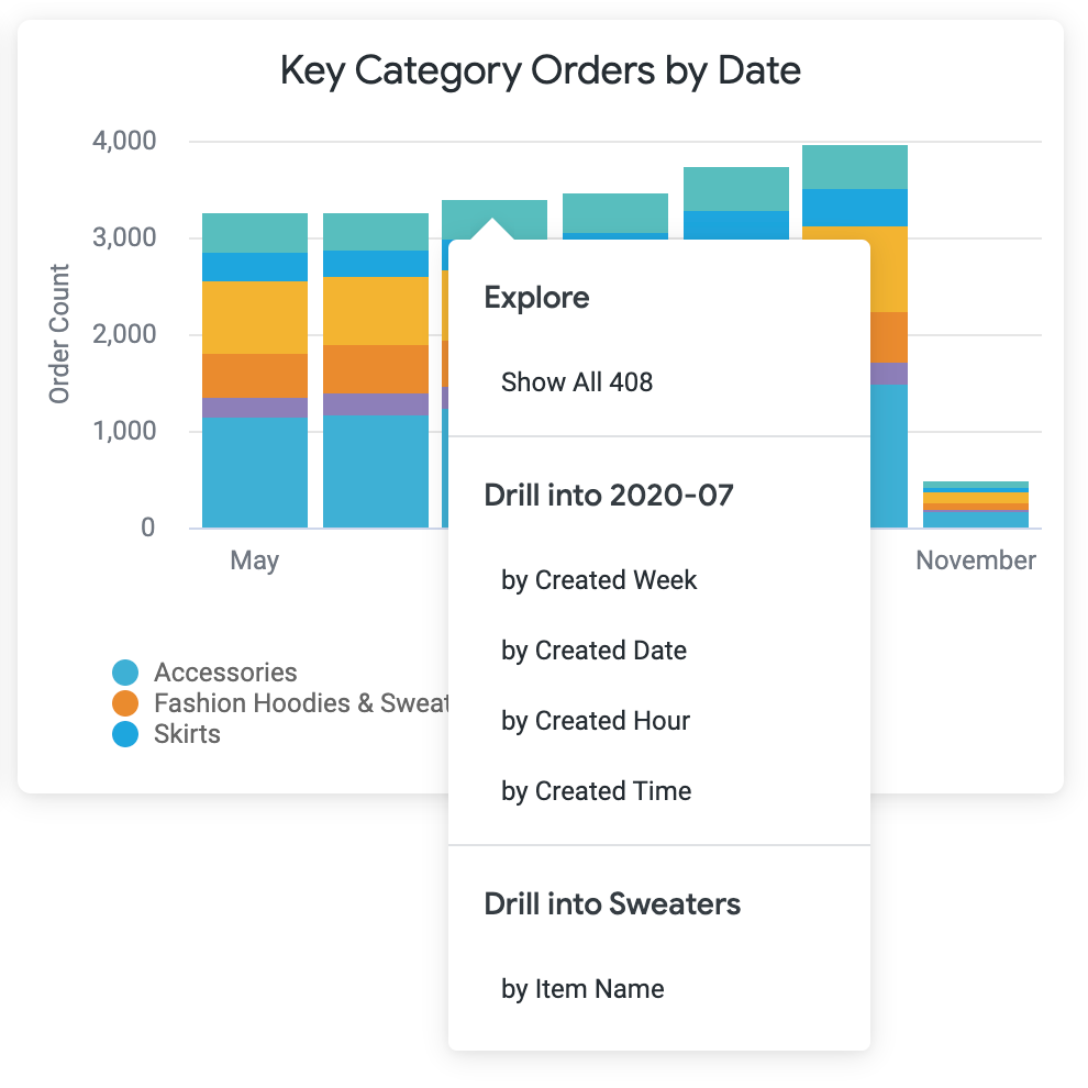 For example, consider a tile with an Order Count measure, grouped by a Clothing type dimension and pivoted on an Order Created date dimension. Say that you want to know more about sweater orders in July. You click on the sweaters bar in the July stack, and Looker displays a drill menu for sweater orders in July.