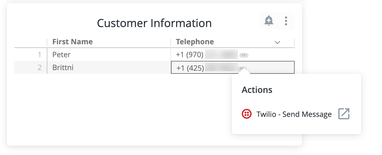 In the preceding example, the Telephone field has a Twilio action. When you click the phone number and select the Twilio action, a pop-up form prompts you to enter a message. Then Twilio sends that message to the phone number.