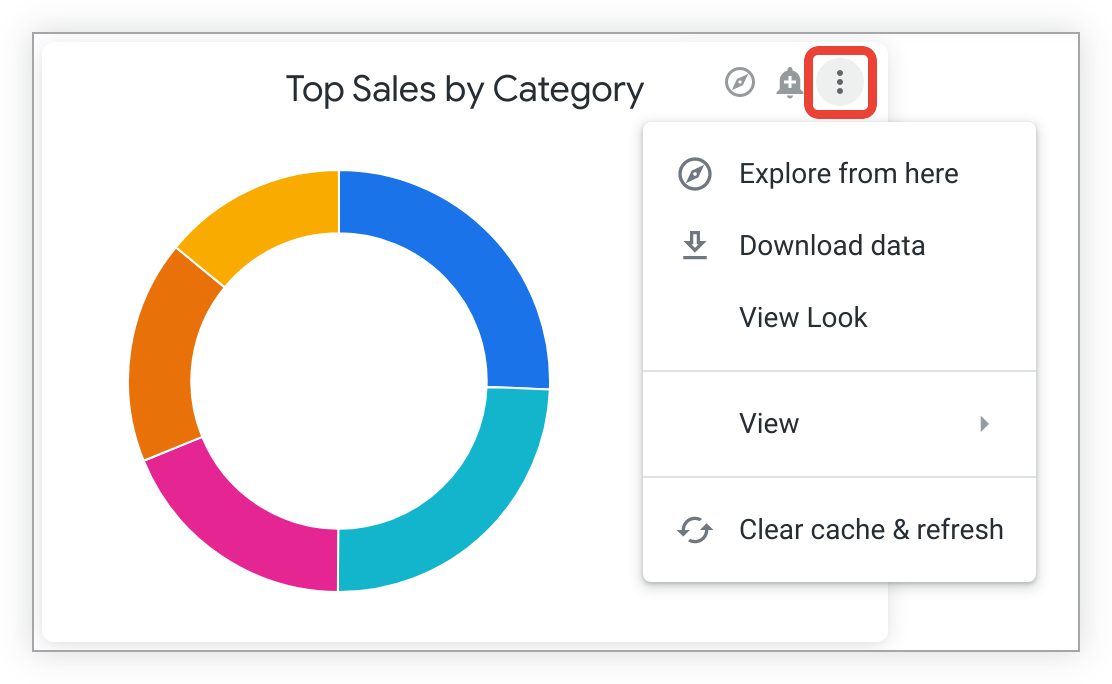 If your Looker admin has enabled the Full Screen Visualizations setting, you will see an additional menu item in each tile's three-dot Tile actions menu, View. Selecting View opens a submenu that reveals options for Expanded or Full Screen:
